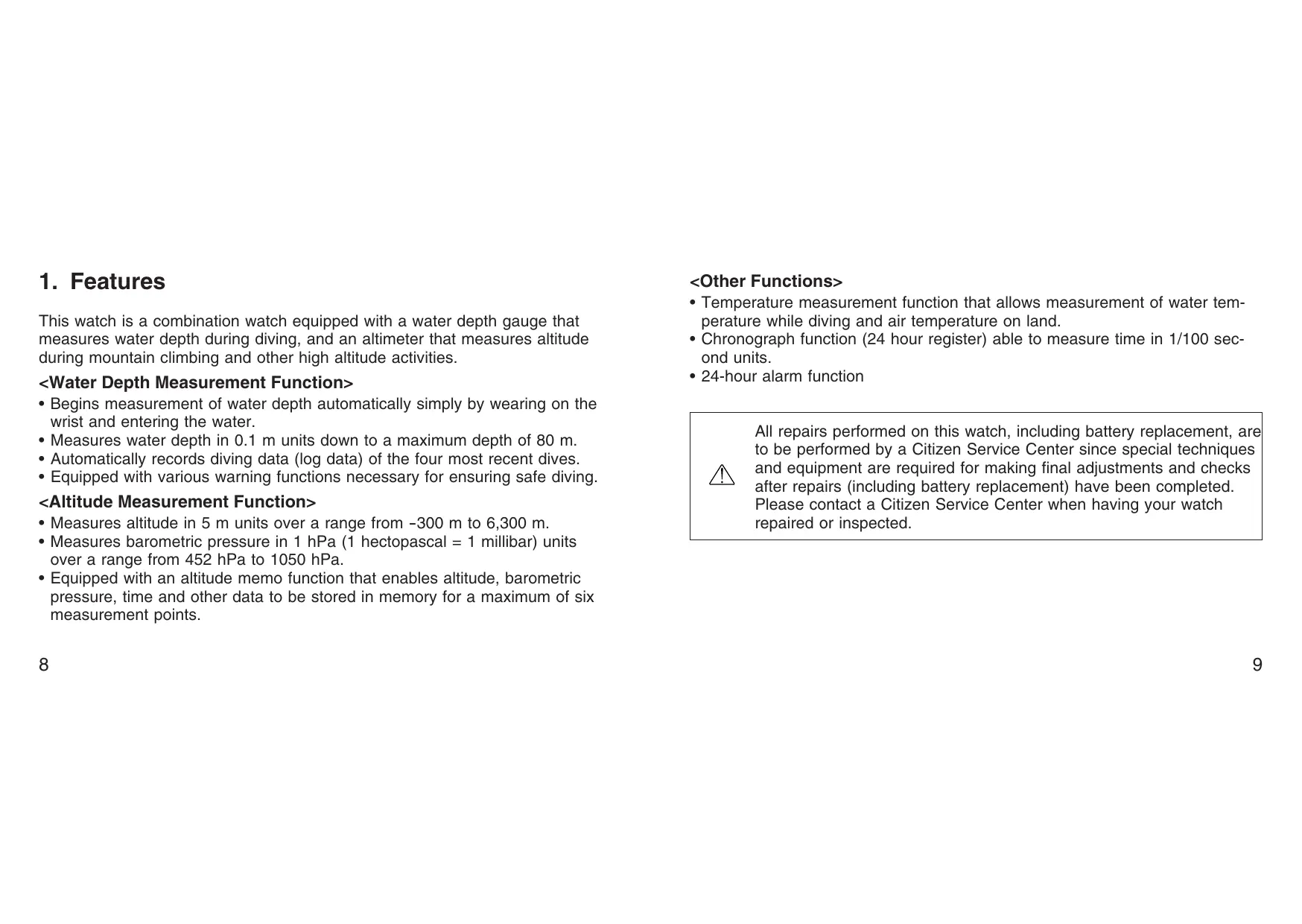 This watch is a combination watch equipped with a water depth gauge that measures water depth during diving, and an altimeter that measures altitude during mountain climbing and other high altitude activities. <Water Depth Measurement Function> + Begins measurement of water depth automatically simply by wearing on the wrist and entering the water. + Measures water depth in 0.1 m units down to a maximum depth of 80 m. + Automatically records diving data (log data) of the four most recent dives. + Equipped with various warning functions necessary for ensuring safe diving. <Altitude Measurement Function> + Measures altitude in 5 m units over a range from -300 m to 6,300 m. + Measures barometric pressure in 1 hPa (1 hectopascal = 1 millibar) units over a range from 452 hPa to 1050 hPa. + Equipped with an altitude memo function that enables altitude, barometric pressure, time and other data to be stored in memory for a maximum of six measurement points. <Other Functions> + Temperature measurement function that allows measurement of water tem- perature while diving and air temperature on land. + Chronograph function (24 hour register) able to measure time in 1/100 sec- ond units. + 24-hour alarm function All repairs performed on this watch, including battery replacement, arel to be performed by a Citizen Service Center since special techniques ÂÀ and equipment are required for making final adjustments and checks after repairs (including battery replacement) have been completed. Please contact a Citizen Service Center when having your watch repaired or inspected.