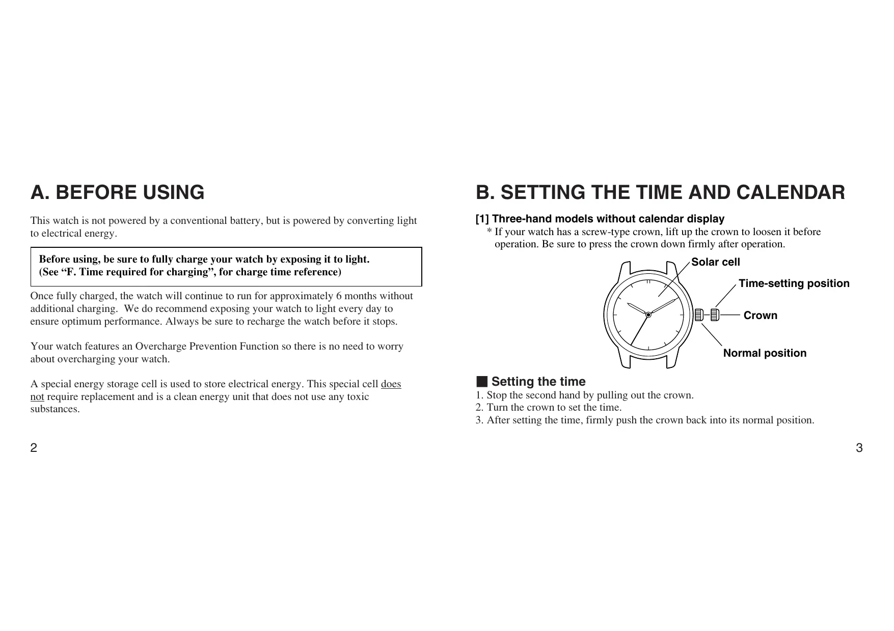 This watch is not powered by a conventional battery, but is powered by converting light to electrical energy. Before using, be sure to fully charge your watch by exposing it to light. (See “F. Time required for charging”, for charge time reference) Once fully charged, the watch will continue to run for approximately 6 months without additional charging. We do recommend exposing your watch to light every day to ensure optimum performance. Always be sure to recharge the watch before it stops. Your watch features an Overcharge Prevention Function so there is no need to worry about overcharging your watch. A special energy storage cell is used to store electrical energy. This special cell does not require replacement and is a clean energy unit that does not use any toxic substances.
