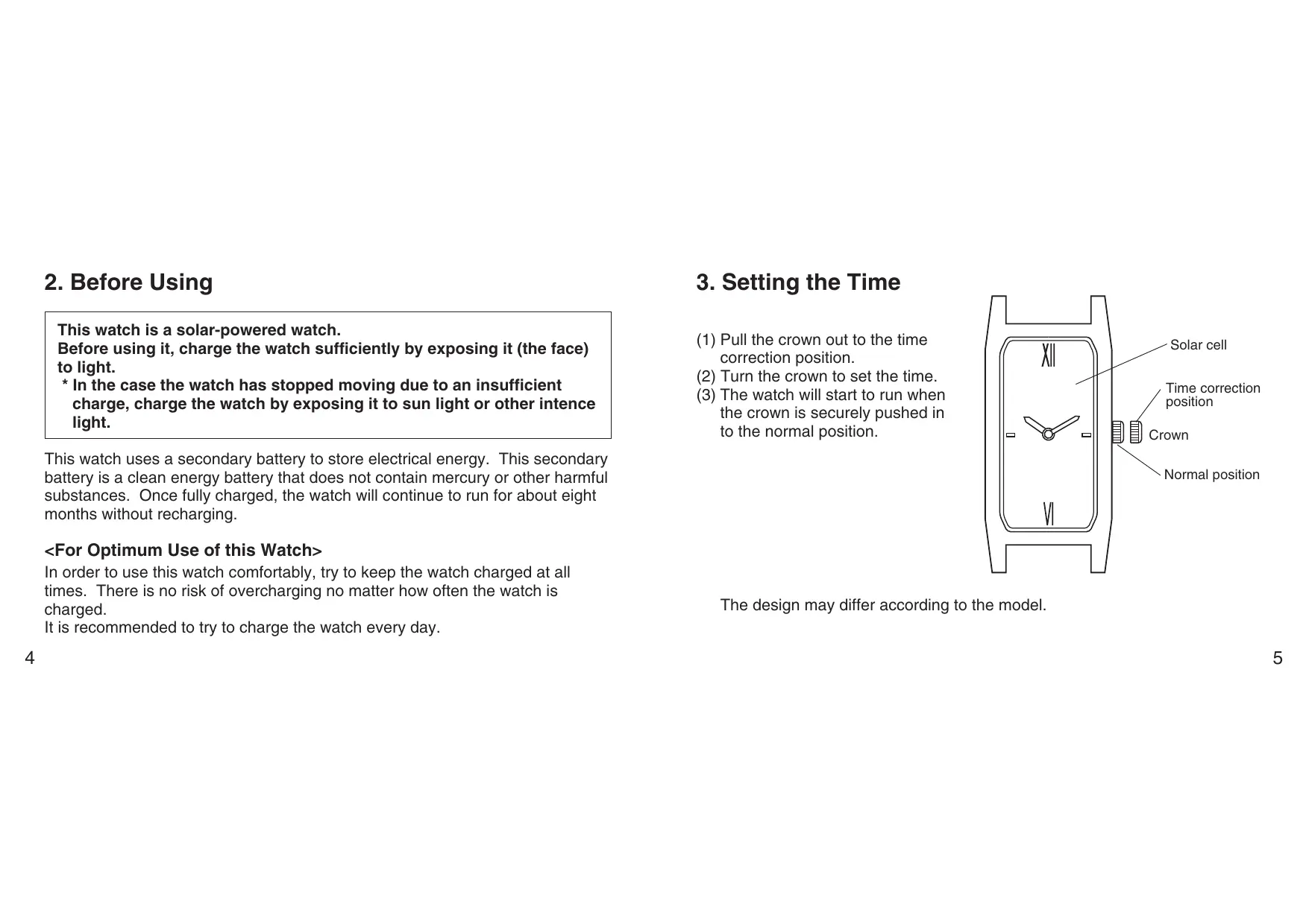 (1) Pull the crown out to the time correction position. (2) Turn the crown to set the time. (3) The watch will start to run when the crown is securely pushed in to the normal position. The design may differ according to the model. Solar cell Time correction position Crown N Normal position