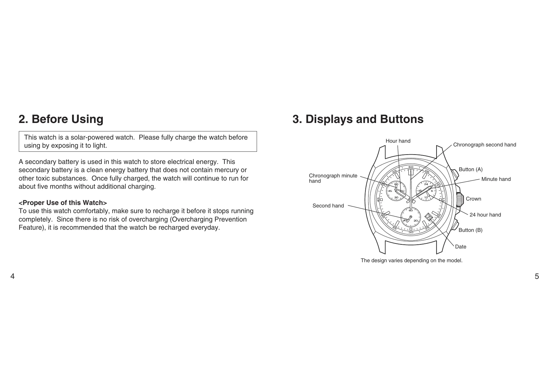 This watch is a solar-powered watch. Please fully charge the watch before using by exposing it to light. A secondary battery is used in this watch to store electrical energy. This secondary battery is a clean energy battery that does not contain mercury or other toxic substances. Once fully charged, the watch will continue to run for about five months without additional charging. <Proper Use of this Watch> To use this watch comfortably, make sure to recharge it before it stops running completely. Since there is no risk of overcharging (Overcharging Prevention Feature), it is recommended that the watch be recharged everyday.