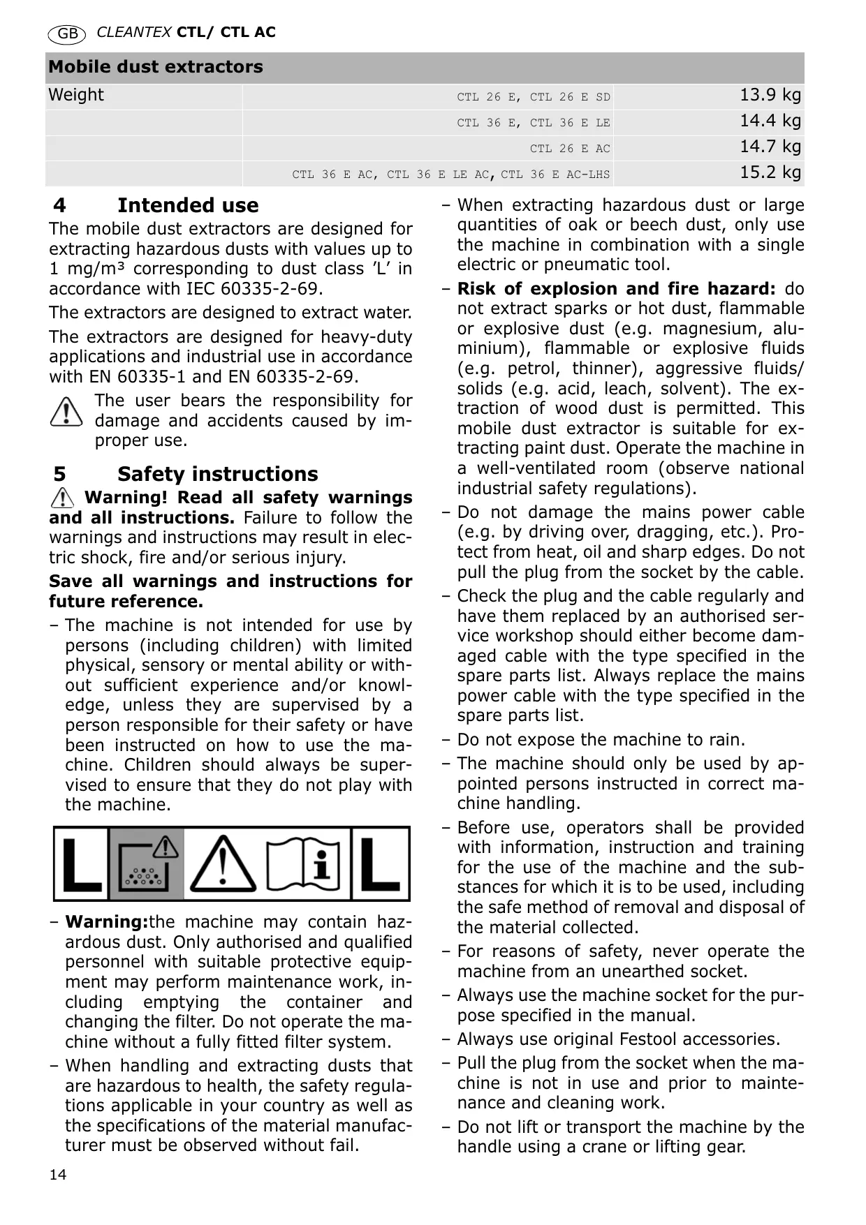 – When extracting hazardous dust or large quantities of oak or beech dust, only use the machine in combination with a single electric or pneumatic tool. – Risk of explosion and fire hazard: do not extract sparks or hot dust, flammable or explosive dust (e.g. magnesium, aluminium), flammable or explosive fluids (e.g. petrol, thinner), aggressive fluids/ solids (e.g. acid, leach, solvent). The extraction of wood dust is permitted. This mobile dust extractor is suitable for extracting paint dust. Operate the machine in a well-ventilated room (observe national industrial safety regulations). – Do not damage the mains power cable (e.g. by driving over, dragging, etc.). Protect from heat, oil and sharp edges. Do not pull the plug from the socket by the cable. – Check the plug and the cable regularly and have them replaced by an authorised service workshop should either become damaged cable with the type specified in the spare parts list. Always replace the mains power cable with the type specified in the spare parts list. – Do not expose the machine to rain. – The machine should only be used by appointed persons instructed in correct machine handling. – Before use, operators shall be provided with information, instruction and training for the use of the machine and the substances for which it is to be used, including the safe method of removal and disposal of the material collected. – For reasons of safety, never operate the machine from an unearthed socket. – Always use the machine socket for the purpose specified in the manual. – Always use original Festool accessories. – Pull the plug from the socket when the machine is not in use and prior to maintenance and cleaning work. – Do not lift or transport the machine by the handle using a crane or lifting gear.