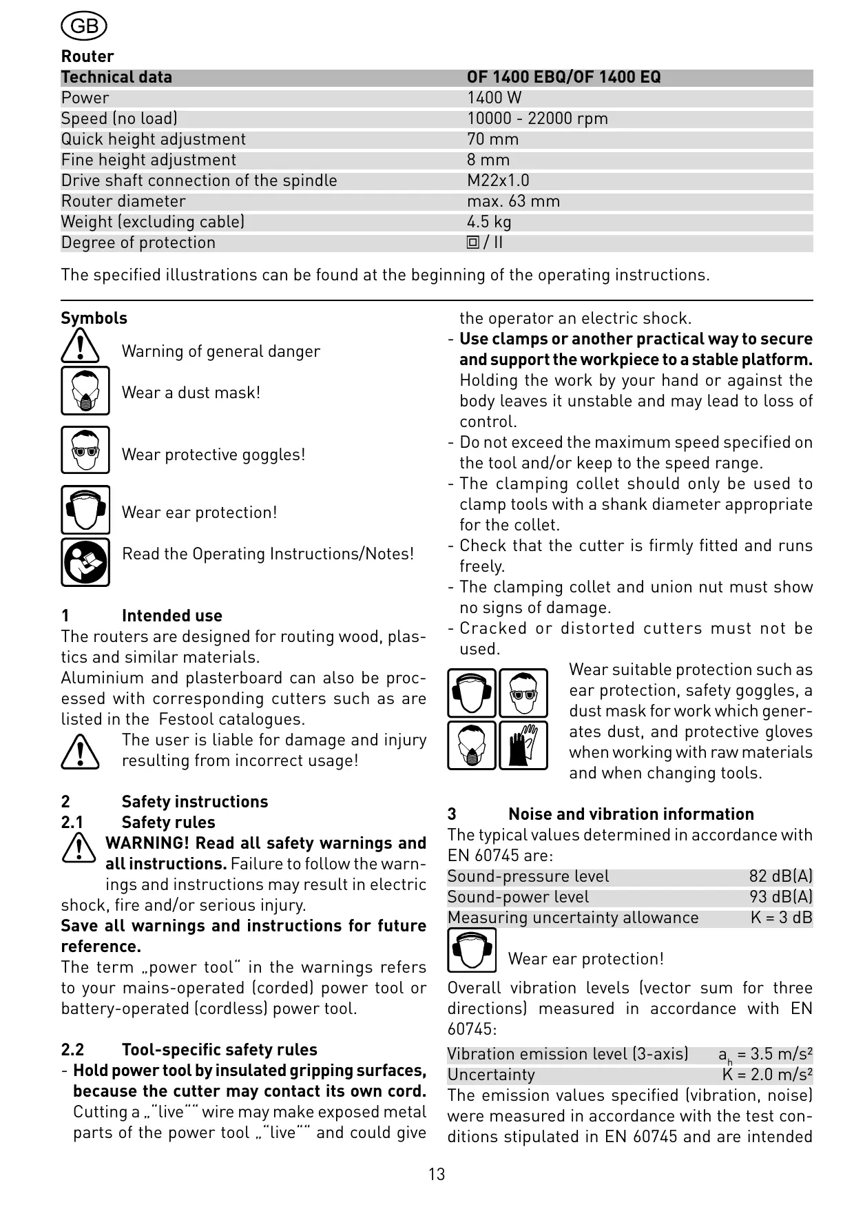 / II The specified illustrations can be found at the beginning of the operating instructions. Symbols the operator an electric shock. - Use clamps or another practical way to secure and support the workpiece to a stable platform. Holding the work by your hand or against the body leaves it unstable and may lead to loss of control. - Do not exceed the maximum speed specified on the tool and/or keep to the speed range. - The clamping collet should only be used to clamp tools with a shank diameter appropriate for the collet. - Check that the cutter is firmly fitted and runs freely. - The clamping collet and union nut must show no signs of damage. - Cracked or distorted cutters must not be used. Wear suitable protection such as ear protection, safety goggles, a dust mask for work which generates dust, and protective gloves when working with raw materials and when changing tools. Warning of general danger Wear a dust mask! Wear protective goggles! Wear ear protection! Read the Operating Instructions/Notes!