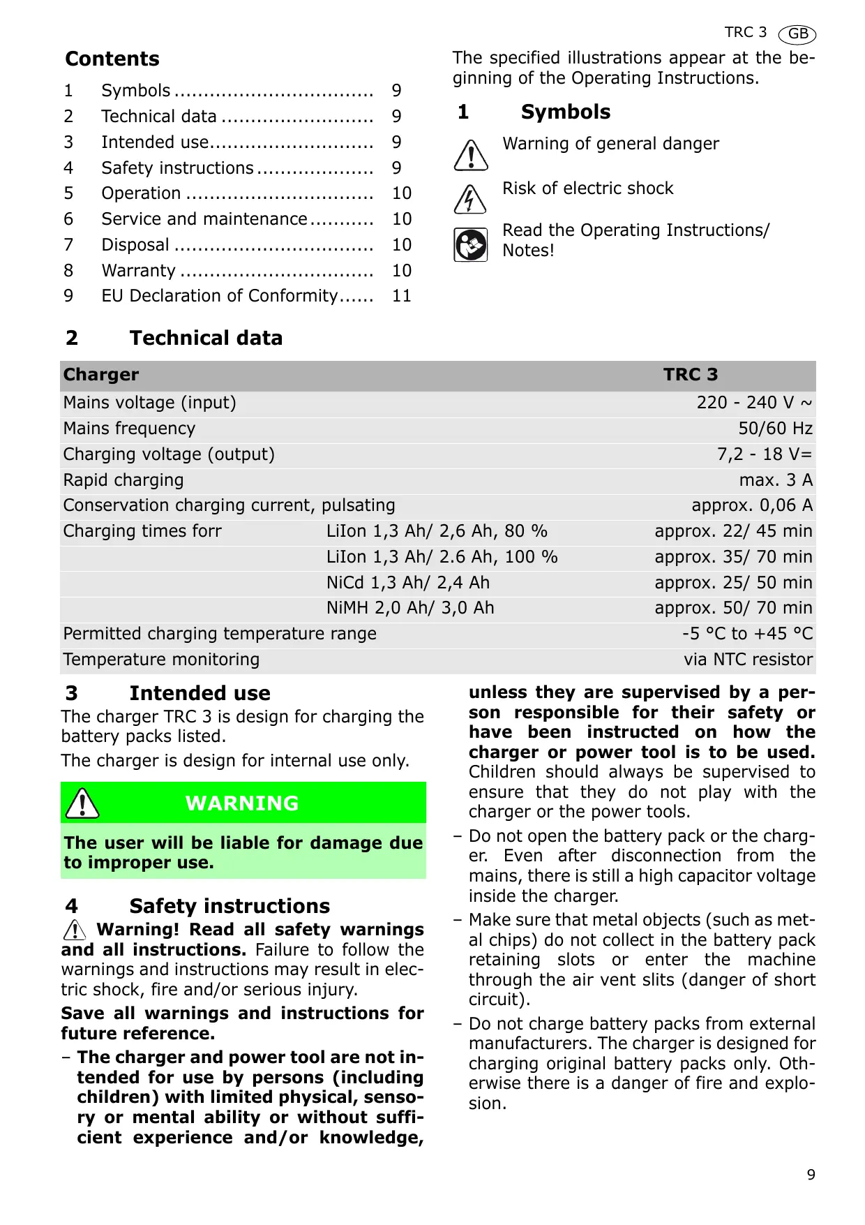 Conservation charging current, pulsating Charging times forr LiIon 1,3 Ah/ 2,6 Ah, 80 % LiIon 1,3 Ah/ 2.6 Ah, 100 % NiCd 1,3 Ah/ 2,4 Ah NiMH 2,0 Ah/ 3,0 Ah Permitted charging temperature range Temperature monitoring