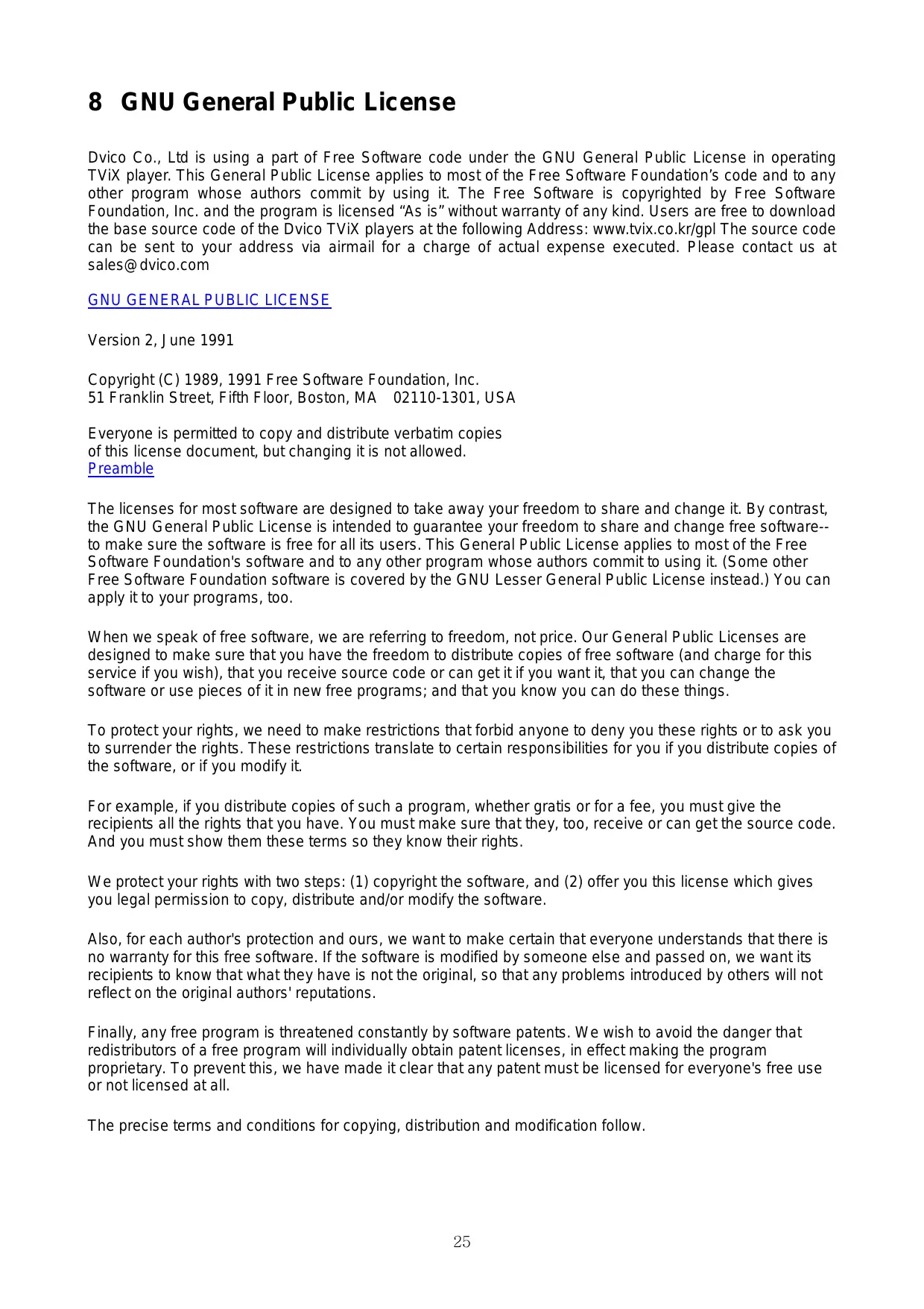 8 GNU General Public License Dvico Co., Ltd is using a part of Free Software code under the GNU General Public License in operating TViX player. This General Public License applies to most of the Free Software Foundation’s code and to any other program whose authors commit by using it. The Free Software is copyrighted by Free Software Foundation, Inc. and the program is licensed “As is” without warranty of any kind. Users are free to download the base source code of the Dvico TViX players at the following Address: www.tvix.co.kr/gpl The source code can be sent to your address via airmail for a charge of actual expense executed. Please contact us at sales@dvico.com