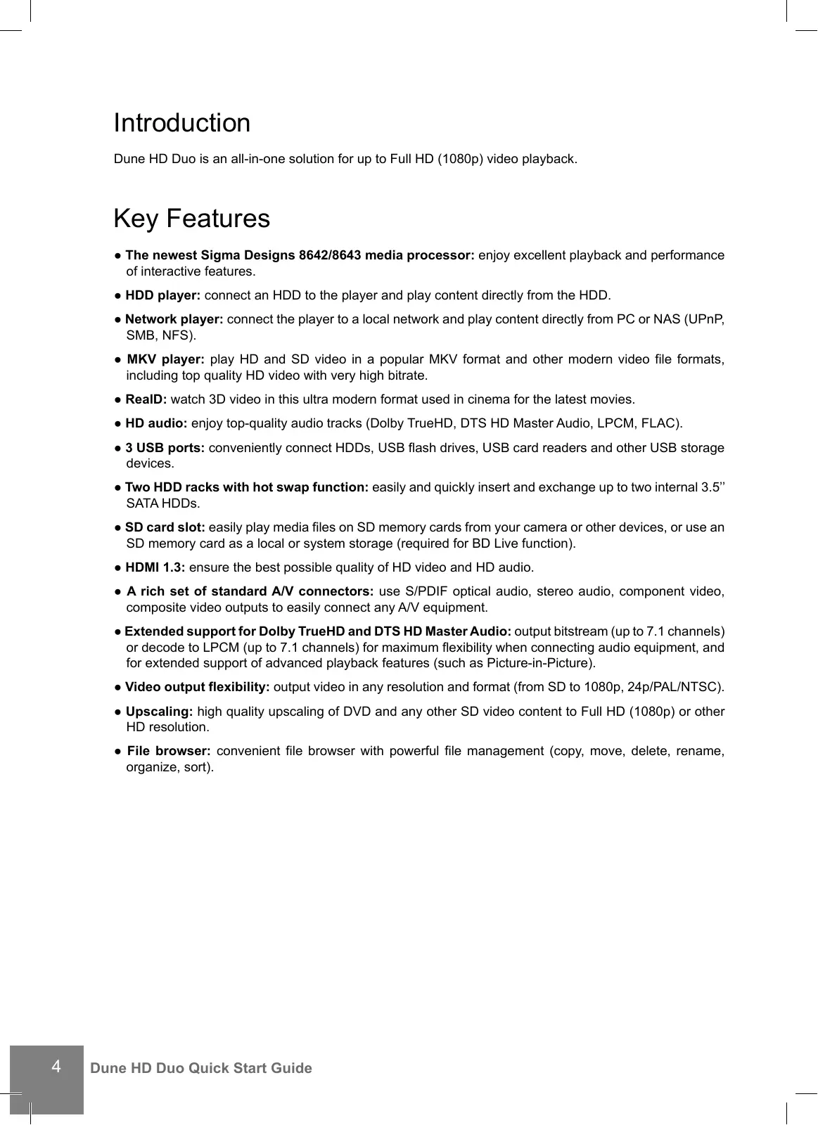 Introduction Dune HD Duo is an all-in-one solution for up to Full HD (1080p) video playback. Key Features ● The newest Sigma Designs 8642/8643 media processor: enjoy excellent playback and performance of interactive features. ● HDD player: connect an HDD to the player and play content directly from the HDD. ● Network player: connect the player to a local network and play content directly from PC or NAS (UPnP, SMB, NFS). ● MKV player: play HD and SD video in a popular MKV format and other modern video file formats, including top quality HD video with very high bitrate. ● RealD: watch 3D video in this ultra modern format used in cinema for the latest movies. ● HD audio: enjoy top-quality audio tracks (Dolby TrueHD, DTS HD Master Audio, LPCM, FLAC). ● 3 USB ports: conveniently connect HDDs, USB flash drives, USB card readers and other USB storage devices. ● Two HDD racks with hot swap function: easily and quickly insert and exchange up to two internal 3.5’’ SATA HDDs. ● SD card slot: easily play media files on SD memory cards from your camera or other devices, or use an SD memory card as a local or system storage (required for BD Live function). ● HDMI 1.3: ensure the best possible quality of HD video and HD audio. ● A rich set of standard A/V connectors: use S/PDIF optical audio, stereo audio, component video, composite video outputs to easily connect any A/V equipment. ● Extended support for Dolby TrueHD and DTS HD Master Audio: output bitstream (up to 7.1 channels) or decode to LPCM (up to 7.1 channels) for maximum flexibility when connecting audio equipment, and for extended support of advanced playback features (such as Picture-in-Picture). ● Video output flexibility: output video in any resolution and format (from SD to 1080p, 24p/PAL/NTSC). ● Upscaling: high quality upscaling of DVD and any other SD video content to Full HD (1080p) or other HD resolution. ● File browser: convenient file browser with powerful file management (copy, move, delete, rename, organize, sort).
