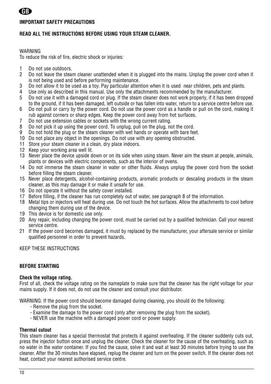 5 Do not use it with a damaged cord or plug. If the steam cleaner does not work properly, if it has been dropped to the ground, if it has been damaged, left outside or has fallen into water, return to a service centre before use.