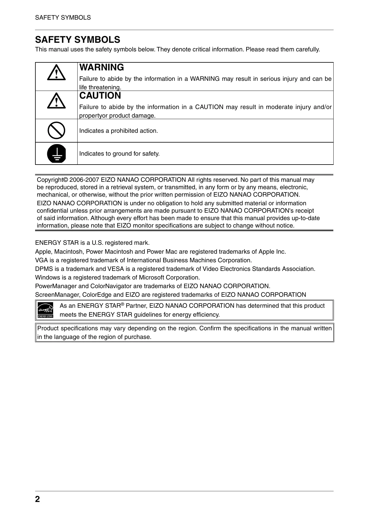 SAFETY SYMBOLS SAFETY SYMBOLS This manual uses the safety symbols below. They denote critical information. Please read them carefully. WARNING Failure to abide by the information in a WARNING may result in serious injury and can be life threatening. CAUTION Failure to abide by the information in a CAUTION may result in moderate injury and/or propertyor product damage. Indicates a prohibited action. Indicates to ground for safety. 0Oo&E Copyright© 2006-2007 EIZO NANAO CORPORATION All rights reserved. No part of this manual may be reproduced, stored in a retrieval system, or transmitted, in any form or by any means, electronic, mechanical, or otherwise, without the prior written permission of E1ZO NANAO CORPORATION. EIZO NANAO CORPORATION is under no obligation to hold any submitted material or information confidential unless prior arrangements are made pursuant to E1ZO NANAO CORPORATION's receipt of said information. Although every effort has been made to ensure that this manual provides up-to-date information, please note that EIZO monitor specifications are subject to change without notice. ENERGY STAR is a US. registered mark. Apple, Macintosh, Power Macintosh and Power Mac are registered trademarks of Apple Inc. VGA is a registered trademark of International Business Machines Corporation. DPMS is a trademark and VESA is a registered trademark of Video Electronics Standards Association. Windows is a registered trademark of Microsoft Corporation. PowerManager and ColorNavigator are trademarks of E1ZO NANAO CORPORATION. ScreenManager, ColorEdge and ElZO are registered trademarks of E1ZO NANAO CORPORATION BY As an ENERGY STAR® Partner, EIZO NANAO CORPORATION has determined that this product meets the ENERGY STAR guidelines for energy efficiency. Product specifications may vary depending on the region. Confirm the specifications in the manual written in the language of the region of purchase.