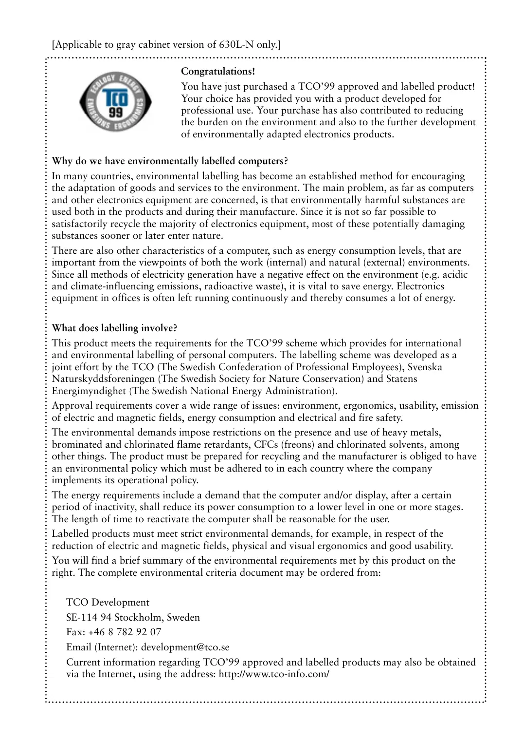 Current information regarding TCO'99 approved and labelled products may also be obtained via the Internet, using the address: http://www.tco-info.com/