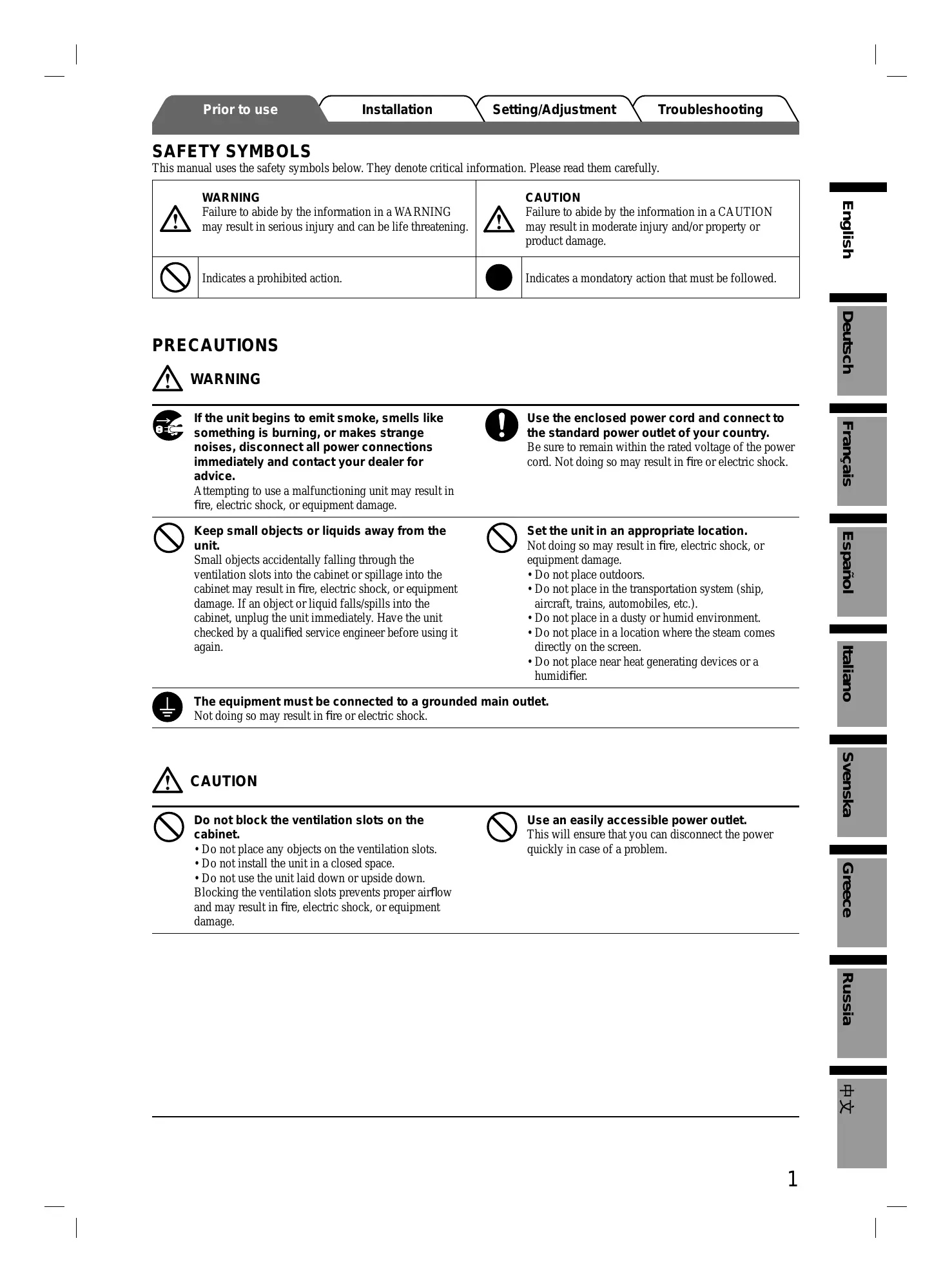 Keep small objects or liquids away from the unit. Small objects accidentally falling through the ventilation slots into the cabinet or spillage into the cabinet may result in fire, electric shock, or equipment damage. If an object or liquid falls/spills into the cabinet, unplug the unit immediately. Have the unit checked by a qualified service engineer before using it again. Set the unit in an appropriate location. Not doing so may result in fire, electric shock, or equipment damage. + Do not place outdoors. + Do not place in the transportation system (ship, aircraft, trains, automobiles, etc.). + Do not place in a dusty or humid environment. + Do not place in a location where the steam comes directly on the screen. + Do not place near heat generating devices or a humidifier. The equipment must be connected to a grounded main outlet. Not doing so may result in fire or electric shock. À cauTIoN