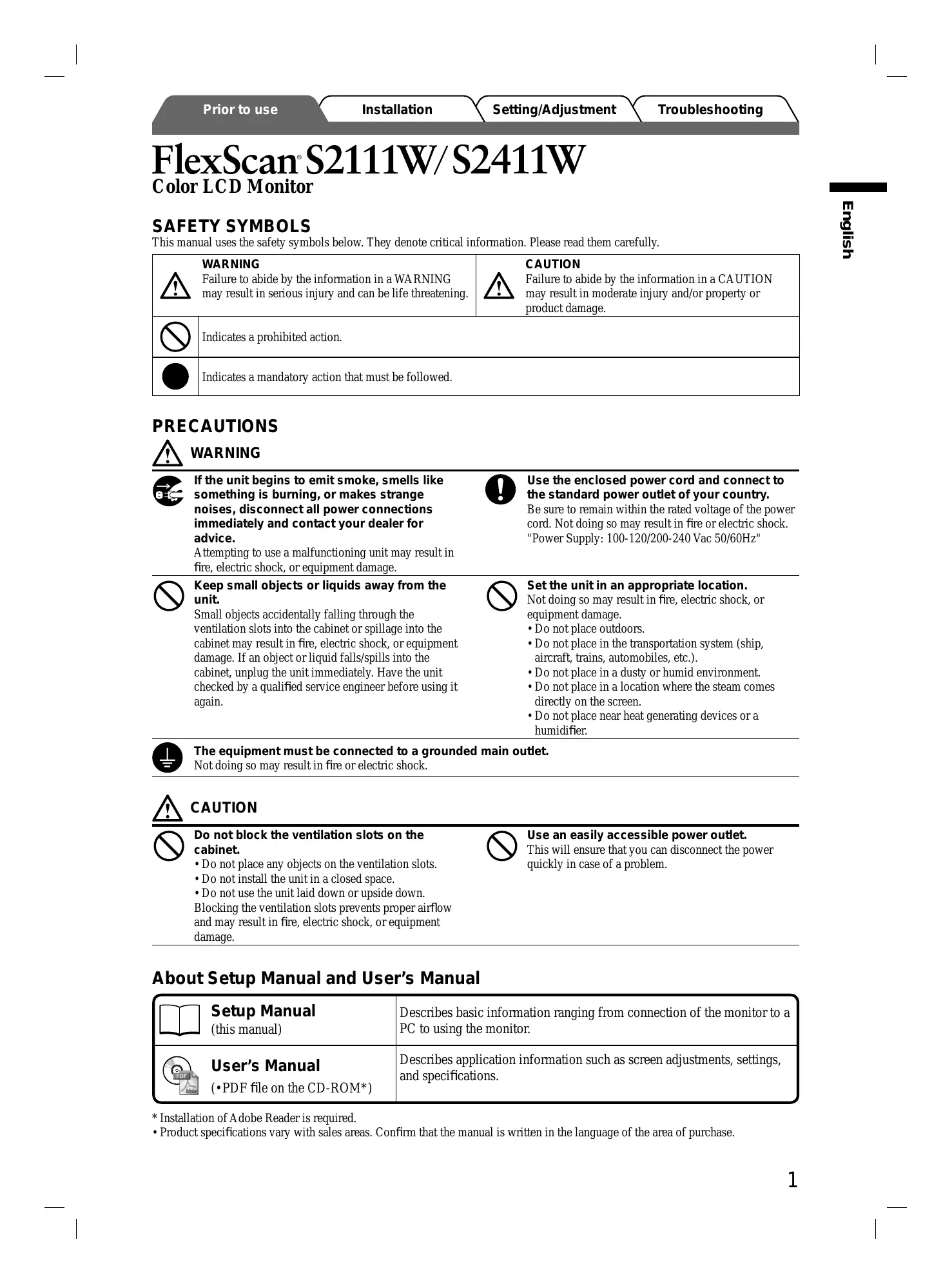 rto use Installation Setting/Adjustment Troubleshooting FlexScan S2111W/S2411W Color LCD Monitor SAFETY SYMBOLS This manual uses the safety symbols below. They denote critical information. Please read them carefully. WARNING CAUTION À Failure to abide by the information in a WARNING À Failure to abide by the information in a CAUTION may result in serious injury and can be life threatening. may result in moderate injury and/or property or product damage. O Indicates a prohibited action. @ Indicates a mandatory action that must be followed. PRECAUTIONS AN varnine If the unit begins to emit smoke, smells like Use the enclosed power cord and connect to & something is burning, or makes strange O the standard power outlet of your country. noises, disconnect all power connections Be sure to remain within the rated voltage of the power immediately and contact your dealer for cord. Not doing so may result in fire or electric shock. advice. "Power Supply: 100-120/200-240 Vac 50/60Hz" Attempting to use a malfunctioning unit may result in fire, electric shock, or equipment damage. Keep small objects or liquids away from the Set the unit in an appropriate location. SO unit. O Not doing so may result in fire, electric shock, or Small objects accidentally falling through the equipment damage. ventilation slots into the cabinet or spillage into the + Do not place outdoors. cabinet may result in fire, electric shock, or equipment * Do not place in the transportation system (ship, damage. If an object or liquid falls/spills into the aircraft, trains, automobiles, etc.). cabinet, unplug the unit immediately. Have the unit + Do not place in a dusty or humid environment. checked by a qualified service engineer before using it + Do not place in a location where the steam comes again. directly on the screen. + Do not place near heat generating devices or a humidifier. The equipment must be connected to a grounded main outlet. Not doing so may result in fire or electric shock. VAN CAUTION Do not block the ventilation slots on the Use an easily accessible power outlet. cabinet. This will ensure that you can disconnect the power + Do not place any objects on the ventilation slots. quickly in case of a problem. + Do not install the unit in a closed space. + Do not use the unit laid down or upside down. Blocking the ventilation slots prevents proper airflow and may result in fire, electric shock, or equipment damage. About Setup Manual and User'’s Manual Setup Manual Describes basic information ranging from connection of the monitor to a (this manual) PC to using the monitor. à User’s Manual Describes application information such as screen adjustments, settings, and specifications. (PDF file on the CD-ROM*)