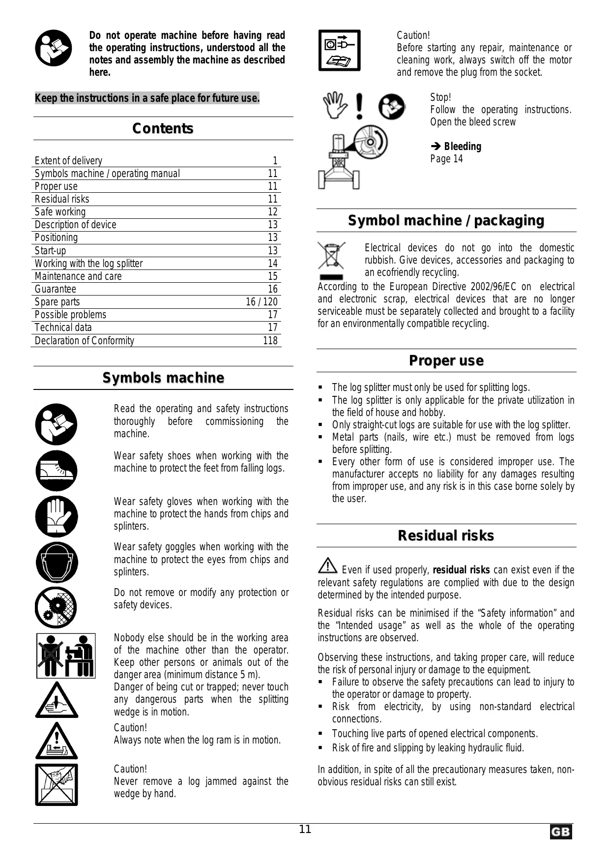 Do not operate machine before having read the operating instructions, understood all the notes and assembly the machine as described here. Caution! Before starting any repair, maintenance or cleaning work, always switch off the motor and remove the plug from the socket. Stop! Follow the operating instructions. Open the bleed screw Keep the instructions in a safe place for future use. Contents Extent of delivery Symbols machine / operating manual Proper use Residual risks Safe working Description of device Positioning Start-up Working with the log splitter Maintenance and care Guarantee Spare parts Possible problems Technical data Declaration of Conformity Î Bleeding Page 14