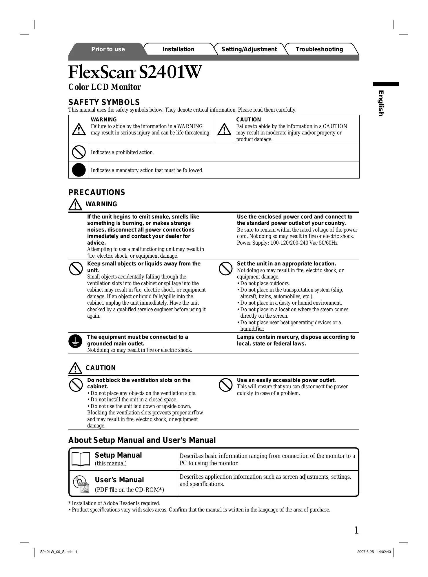 Prior to use Installation FlexScan S2401W Color LCD Monitor SAFETY SYMBOLS This manual uses the safety symbols below. They denote critical information. Please read them carefully. Setting/Adjustment Troubleshooting