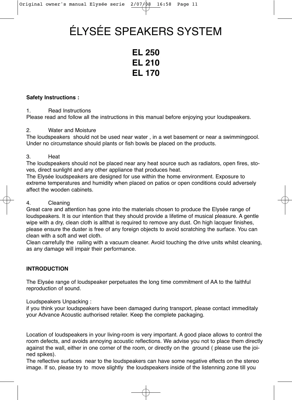if you think your loudspeakers have been damaged during transport, please contact immediately your Advance Acoustic authorised retailer. Keep the complete packaging.