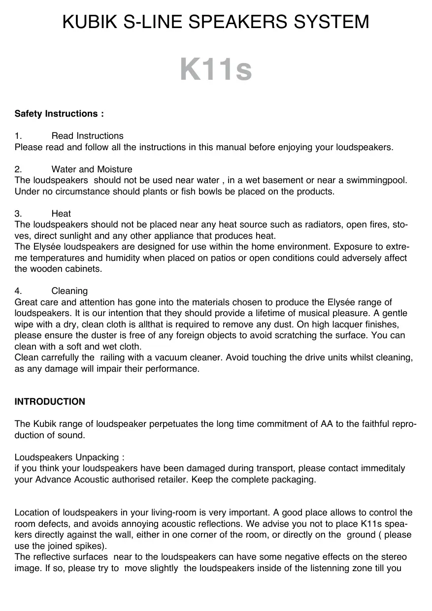 K11s Safety Instructions : Read Instructions Please read and follow all the instructions in this manual before enjoying your loudspeakers. Water and Moisture The loudspeakers should not be used near water , in a wet basement or near a swimmingpool. Under no circumstance should plants or fish bowls be placed on the products. Heat The loudspeakers should not be placed near any heat source such as radiators, open fires, stoves, direct sunlight and any other appliance that produces heat. The Elysée loudspeakers are designed for use within the home environment. Exposure to extreme temperatures and humidity when placed on patios or open conditions could adversely affect the wooden cabinets. Cleaning Great care and attention has gone into the materials chosen to produce the Elysée range of loudspeakers. It is our intention that they should provide a lifetime of musical pleasure. A gentle wipe with a dry, clean cloth is allthat is required to remove any dust. On high lacquer finishes, please ensure the duster is free of any foreign objects to avoid scratching the surface. You can clean with a soft and wet cloth. Clean carrefully the railing with a vacuum cleaner. Avoid touching the drive units whilst cleaning, as any damage will impair their performance. INTRODUCTION The Kubik range of loudspeaker perpetuates the long time commitment of AA to the faithful reproduction of sound. Loudspeakers Unpacking : if you think your loudspeakers have been damaged during transport, please contact immeditaly your Advance Acoustic authorised retailer. Keep the complete packaging. Location of loudspeakers in your living-room is very important. A good place allows to control the room defects, and avoids annoying acoustic reflections. We advise you not to place K11s speakers directly against the wall, either in one corner of the room, or directly on the ground ( please use the joined spikes). The reflective surfaces near to the loudspeakers can have some negative effects on the stereo image. If so, please try to move slightly the loudspeakers inside of the listenning zone till you obtain the better sound. It’s really important to notice that the K11s loudspeakers have the bass drivers inside so face to face. In some cases of reverberation room whose walls are far more than a metre of loudspeakers, it’s possible to reverse the loudspeakers position. Test the sound quality on different sources. K11s installation