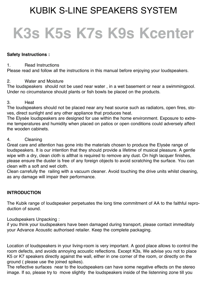 K3s K5s K7s K9s Kcenter Safety Instructions : Read Instructions Please read and follow all the instructions in this manual before enjoying your loudspeakers. Water and Moisture The loudspeakers should not be used near water , in a wet basement or near a swimmingpool. Under no circumstance should plants or fish bowls be placed on the products. Heat The loudspeakers should not be placed near any heat source such as radiators, open fires, stoves, direct sunlight and any other appliance that produces heat. The Elysée loudspeakers are designed for use within the home environment. Exposure to extreme temperatures and humidity when placed on patios or open conditions could adversely affect the wooden cabinets. Cleaning Great care and attention has gone into the materials chosen to produce the Elysée range of loudspeakers. It is our intention that they should provide a lifetime of musical pleasure. A gentle wipe with a dry, clean cloth is allthat is required to remove any dust. On high lacquer finishes, please ensure the duster is free of any foreign objects to avoid scratching the surface. You can clean with a soft and wet cloth. Clean carrefully the railing with a vacuum cleaner. Avoid touching the drive units whilst cleaning, as any damage will impair their performance. INTRODUCTION The Kubik range of loudspeaker perpetuates the long time commitment of AA to the faithful reproduction of sound. Loudspeakers Unpacking : if you think your loudspeakers have been damaged during transport, please contact immeditaly your Advance Acoustic authorised retailer. Keep the complete packaging. Location of loudspeakers in your living-room is very important. A good place allows to control the room defects, and avoids annoying acoustic reflections. Except K3s, We advise you not to place K5 or K7 speakers directly against the wall, either in one corner of the room, or directly on the ground ( please use the joined spikes). The reflective surfaces near to the loudspeakers can have some negative effects on the stereo image. If so, please try to move slightly the loudspeakers inside of the listenning zone till you obtain the better sound. It’s really important to the loudspeakers K5s, K7s and K9s to have the bass drivers inside so face to face. In some cases of reverberation room whose walls are far more than a metre of loudspeakers, it’s possible to reverse the loudspeakers position. Test carefully on several CD. K5s/K7s/K9s installation