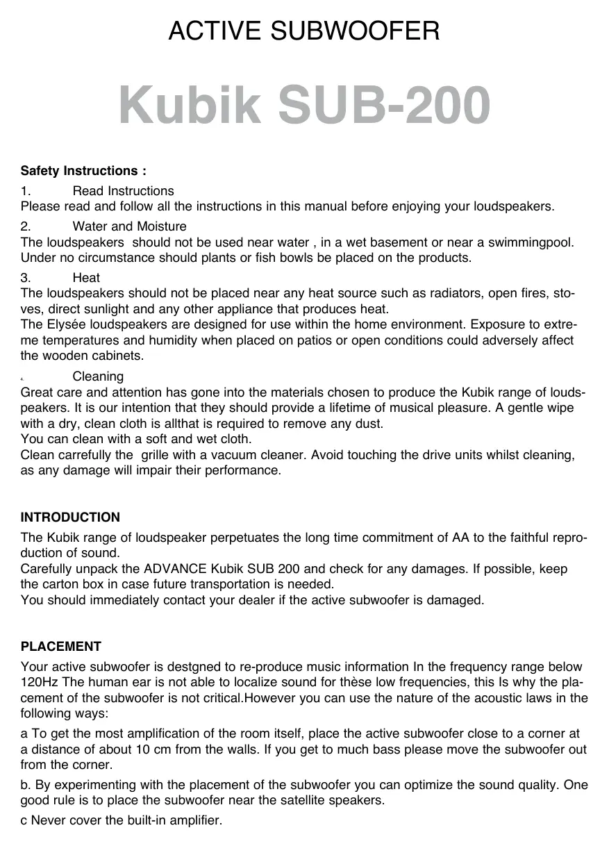 INTRODUCTION The Kubik range of loudspeaker perpetuates the long time commitment of AA to the faithful reproduction of sound. Carefully unpack the ADVANCE Kubik SUB 200 and check for any damages. If possible, keep the carton box in case future transportation is needed. You should immediately contact your dealer if the active subwoofer is damaged. PLACEMENT Your active subwoofer is destgned to re-produce music information In the frequency range below 120Hz The human ear is not able to localize sound for thèse low frequencies, this Is why the placement of the subwoofer is not critical.However you can use the nature of the acoustic laws in the following ways: a To get the most amplification of the room itself, place the active subwoofer close to a corner at a distance of about 10 cm from the walls. If you get to much bass please move the subwoofer out from the corner. b. By experimenting with the placement of the subwoofer you can optimize the sound quality. One good rule is to place the subwoofer near the satellite speakers. c Never cover the built-in amplifier. WARNING To reduce the risk of electnc shock, do not open or remove cover or back. Do not expose this appliance to rain or moisture. In case of malfunction consult qualified service personel INSTALLATION There are two ways to install Your new subwoofer ; below we w(H describe how: