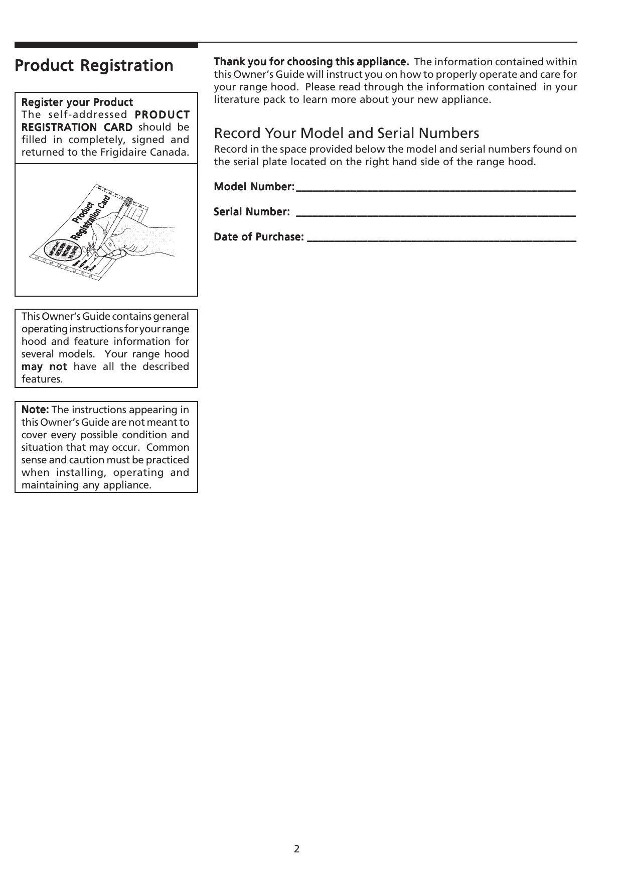 The self-addressed PRODUCT REGISTRATION CARD should be filled in completely, signed and returned to the Frigidaire Canada.