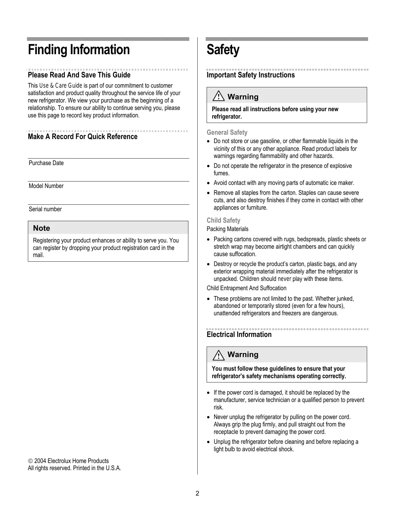 Finding Information Please Read And Save This Guide This Use & Care Guide is part of our commitment to customer satisfaction and product quality throughout the service life of your new refrigerator. We view your purchase as the beginning of a relationship. To ensure our ability to continue serving you, please use this page to record key product information. Make A Record For Quick Reference Purchase Date Model Number Serial number Note Registering your product enhances or ability to serve you. You can register by dropping your product registration card in the mail. © 2004 Electrolux Home Products All rights reserved. Printed in the U.S.A. Safety Important Safety Instructions VAN Warning Please read all instructions before using your new refrigerator. General Safety + Do not store or use gasoline, or other flammable liquids in the vicinity of this or any other appliance. Read product labels for warnings regarding flammability and other hazards. + _ Do not operate the refrigerator in the presence of explosive fumes. *_Avoid contact with any moving parts of automatic ice maker. + Remove all staples from the carton. Staples can cause severe cuts, and also destroy finishes if they come in contact with other appliances or furniture Child Safety Packing Materials + Packing cartons covered with rugs, bedspreads, plastic sheets or stretch wrap may become airtight chambers and can quickly cause suffocation e Destroy or recycle the product's carton, plastic bags, and any exterior wrapping material immediately after the refrigerator is unpacked. Children should never play with these items. Child Entrapment And Suffocation < These problems are not limited to the past. Whether junked, abandoned or temporarily stored (even for a few hours), unattended refrigerators and freezers are dangerous. Electrical Information À Warning You must follow these guidelines to ensure that your refrigerator’s safety mechanisms operating correctly. +_lfthe power cord is damaged, it should be replaced by the manufacturer, service technician or a qualified person to prevent risk. + Never unplug the refrigerator by pulling on the power cord Always grip the plug firmly, and pull straight out from the receptacle to prevent damaging the power cord. °° Unplug the refrigerator before cleaning and before replacing a light bulb to avoid electrical shock.