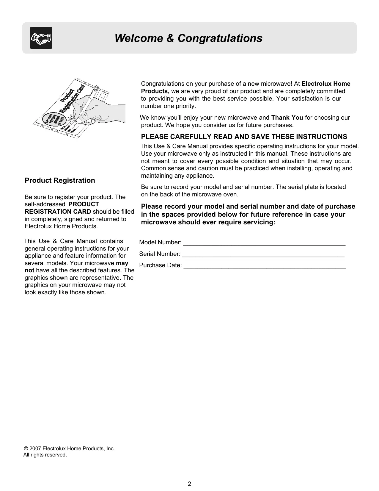 Product Registration Be sure to register your product. The self-addressed PRODUCT REGISTRATION CARD should be filed in completely, signed and returned to Electrolux Home Products. This Use & Care Manual contains general operating instructions for your appliance and feature information for several models. Your microwave may not have all the described features. The graphics shown are representative. The graphics on your microwave may not look exactly like those shown. © 2007 Electrolux Home Products, Inc. All rights reserved. Welcome & Congratulations Congratulations on your purchase of a new microwave! At Electrolux Home Products, we are very proud of our product and are completely committed to providing you with the best service possible. Your satisfaction is our number one priority. We know you'll enjoy your new microwave and Thank You for choosing our product. We hope you consider us for future purchases. PLEASE CAREFULLY READ AND SAVE THESE INSTRUCTIONS This Use & Care Manual provides specific operating instructions for your model. Use your microwave only as instructed in this manual. These instructions are not meant to cover every possible condition and situation that may occur. Common sense and caution must be practiced when installing, operating and maintaining any appliance. Be sure to record your model and serial number. The serial plate is located on the back of the microwave oven. Please record your model and serial number and date of purchase in the spaces provided below for future reference in case your microwave should ever require servicing: Model Number: Serial Number: Purchase Date: