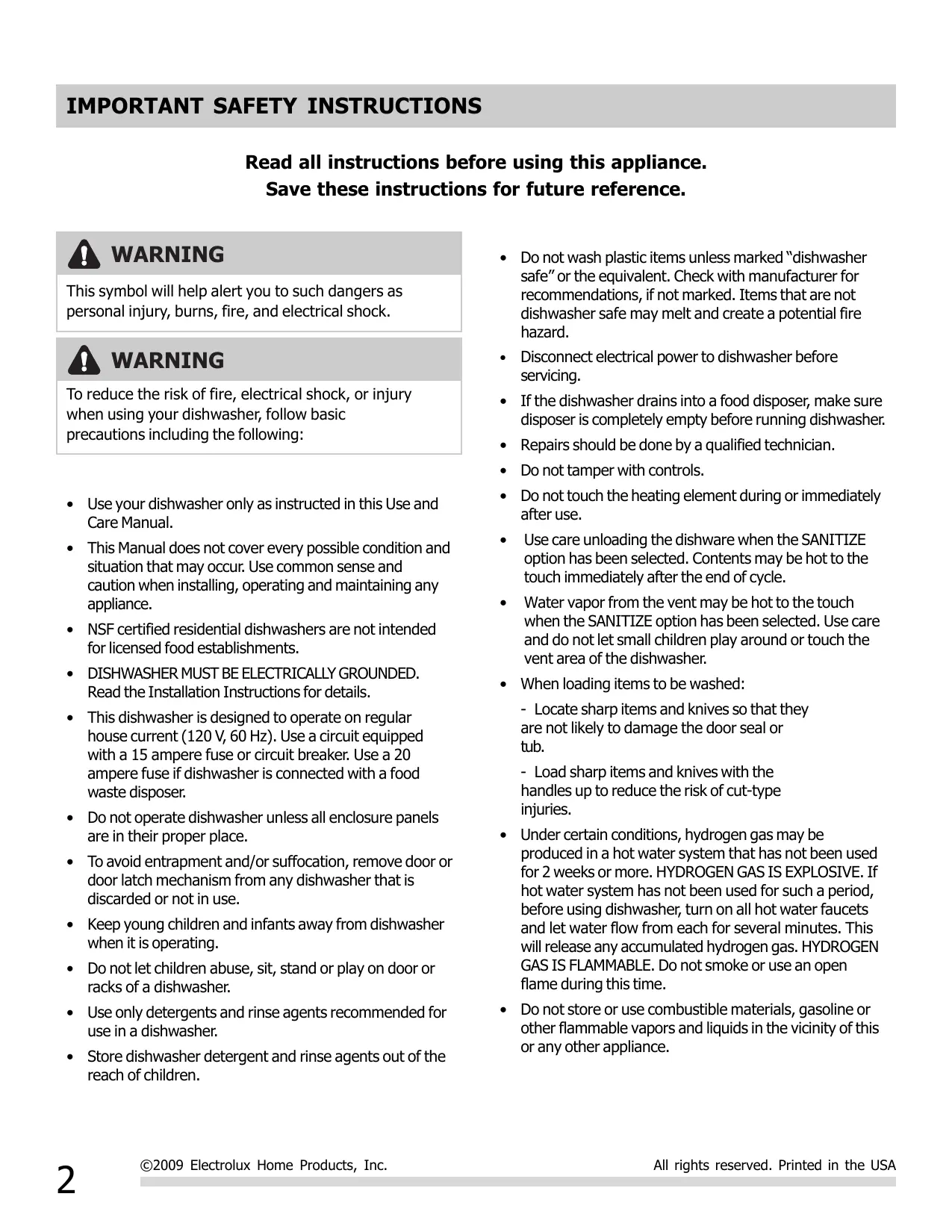 Read all instructions before using this appliance. Save these instructions for future reference. À WARNING This symbol will help alert you to such dangers as personal injury, burns, fire, and electrical shock. À WARNING To reduce the risk of fire, electrical shock, or injury when using your dishwasher, follow basic precautions including the following: <__Use your dishwasher only as instructed in this Use and Care Manual. + __This Manual does not cover every possible condition and situation that may occur. Use common sense and caution when installing, operating and maintaining any appliance. + NSF certified residential dishwashers are not intended for licensed food establishments. + DISHWASHER MUST BE ELECTRICALLY GROUNDED. Read the Installation Instructions for details. + __ This dishwasher is designed to operate on regular house current (120 V, 60 Hz). Use a circuit equipped with a 15 ampere fuse or circuit breaker. Use a 20 ampere fuse if dishwasher is connected with a food waste disposer. +__Do not operate dishwasher unless all enclosure panels are in their proper place. + _ To avoid entrapment and/or suffocation, remove door or door latch mechanism from any dishwasher that is discarded or not in use. + __Keep young children and infants away from dishwasher when it is operating. + Donotlet children abuse, sit, stand or play on door or racks of a dishwasher. + __ Use only detergents and rinse agents recommended for use in a dishwasher. + __ Store dishwasher detergent and rinse agents out of the reach of children. 2 ©2009 Electrolux Home Products, Inc. Do not wash plastic items unless marked “dishwasher safe” or the equivalent. Check with manufacturer for recommendations, if not marked. Items that are not dishwasher safe may melt and create a potential fire hazard. Disconnect electrical power to dishwasher before servicing. Ifthe dishwasher drains into a food disposer, make sure disposer is completely empty before running dishwasher. Repairs should be done by a qualified technician. Do not tamper with controls. Do not touch the heating element during or immediately after use. Use care unloading the dishware when the SANITIZE option has been selected. Contents may be hot to the touch immediately after the end of cycle. Water vapor from the vent may be hot to the touch when the SANITIZE option has been selected. Use care and do not let small children play around or touch the vent area of the dishwasher. When loading items to be washed: - Locate sharp items and knives so that they are not likely to damage the door seal or tub. - Load sharp items and knives with the handles up to reduce the risk of cut-type injuries. Under certain conditions, hydrogen gas may be produced in a hot water system that has not been used for 2 weeks or more. HYDROGEN GAS IS EXPLOSIVE. If hot water system has not been used for such a period, before using dishwasher, turn on all hot water faucets and let water flow from each for several minutes. This will release any accumulated hydrogen gas. HYDROGEN GAS IS FLAMMABLE. Do not smoke or use an open flame during this time. Do not store or use combustible materials, gasoline or other flammable vapors and liquids in the vicinity of this or any other appliance. All rights reserved. Printed in the USA