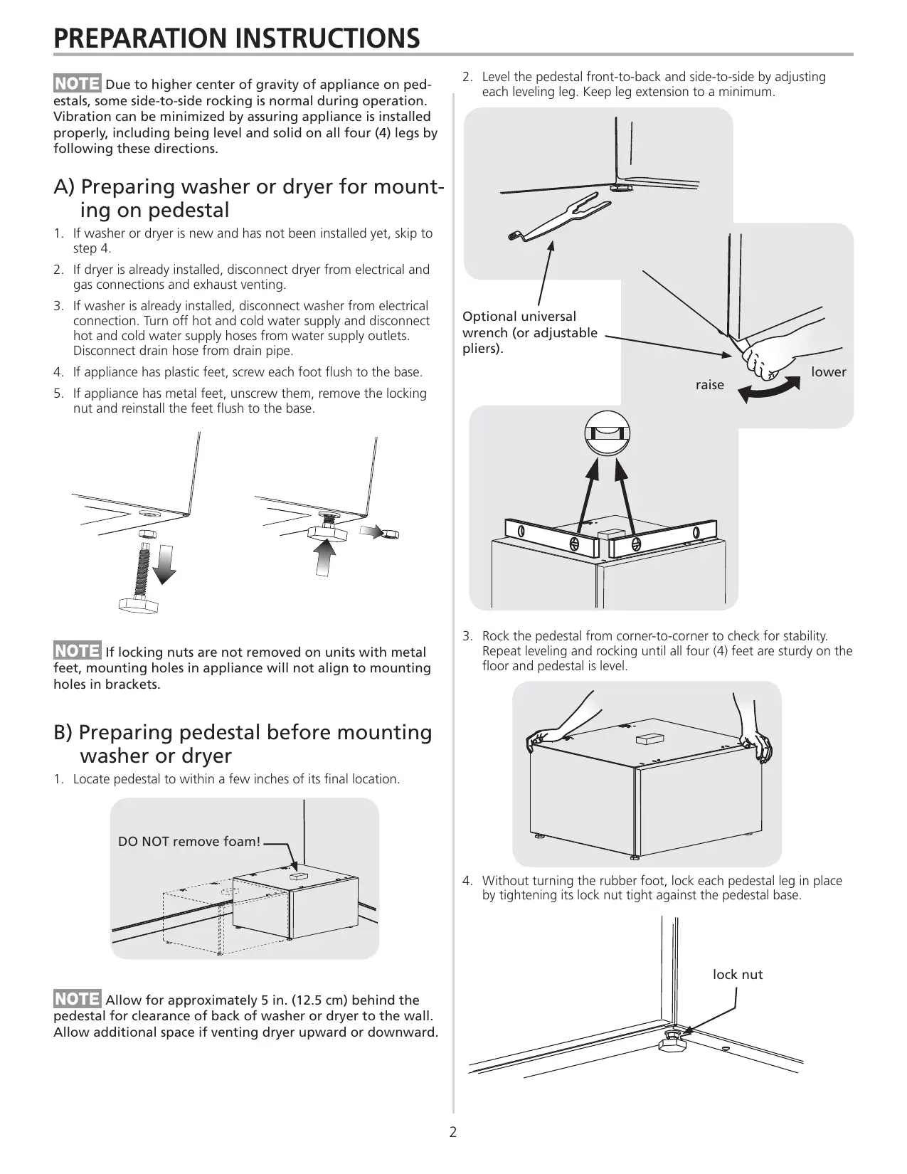 each leveling leg. Keep leg extension to a minimum. Due to higher center of gravity of appliance on pedestals, some side-to-side rocking is normal during operation. Vibration can be minimized by assuring appliance is installed properly, including being level and solid on all four (4) legs by following these directions. A) Preparing washer or dryer for mounting on pedestal
