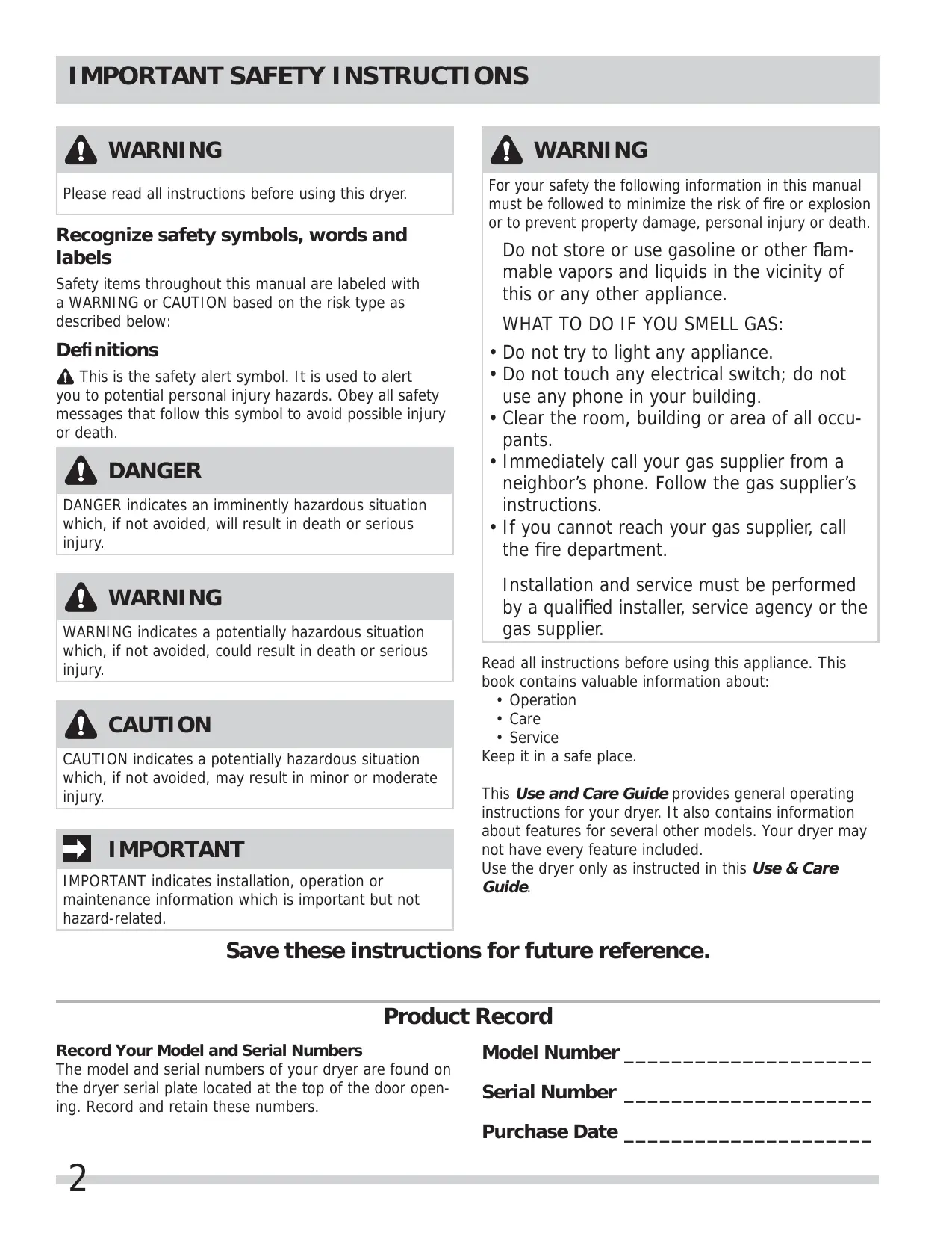 - Care + Service Keep it in a safe place. This Use and Care Guide provides general operating instructions for your dryer. It also contains information about features for several other models. Your dryer may not have every feature included. Use the dryer only as instructed in this Use & Care Guide. Save these instructions for future reference. Product Record Record Your Model and Serial Numbers The model and serial numbers of your dryer are found on the dryer serial plate located at the top of the door open- ing. Record and retain these numbers.