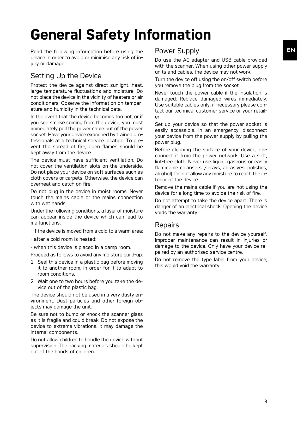 Power Supply Do use the AC adapter and USB cable provided with the scanner. Do use the AC adapter and USB cable provided with the scanner. When using other power supply units and cables, the device may not work. On/Off Switch General Turn the device off using the on/off switch before you remove the plug from the socket. Never touch the power cable if the insulation is damaged. Never touch the power cable if the insulation is damaged. Replace damaged wires immediately. Use suitable cables only; if necessary please contact our technical customer service or your retailer. Set up your device so that the power socket is easily accessible. Set up your device so that the power socket is easily accessible. In an emergency, disconnect your device from the power supply by pulling the power plug. Before cleaning the surface of your device, disconnect it from the power network. Before cleaning the surface of your device, disconnect it from the power network. Use a soft, lint-free cloth. Never use liquid, gaseous or easily flammable cleansers (sprays, abrasives, polishes, alcohol). Do not allow any moisture to reach the interior of the device. Remove the mains cable if you are not using the device for a long time to avoide the risk of fire. Remove the mains cable if you are not using the device for a long time to avoide the risk of fire. Do not attempt to take the device apart. There is danger of an electrical shock. Opening the device voids the warranty. Repairs Repairs Do not make any repairs to the device yourself. Improper maintenance can result in injuries or damage to the device. Only have your device repaired by an authorised service centre. Do not remove the type label from your device; this would void the warranty. 2 Wait one to two hours before you take the device out of the plastic bag. The device should not be used in a very dusty environment. The device should not be used in a very dusty environment. Dust particles and other foreign objects may damage the unit. Be sure not to bump or knock the scanner glass as it is fragile and could break. Do not expose the device to extreme vibrations. It may damage the internal components. Do not allow children to handle the device without supervision. Do not allow children to handle the device without supervision. The packing materials should be kept out of the hands of children.