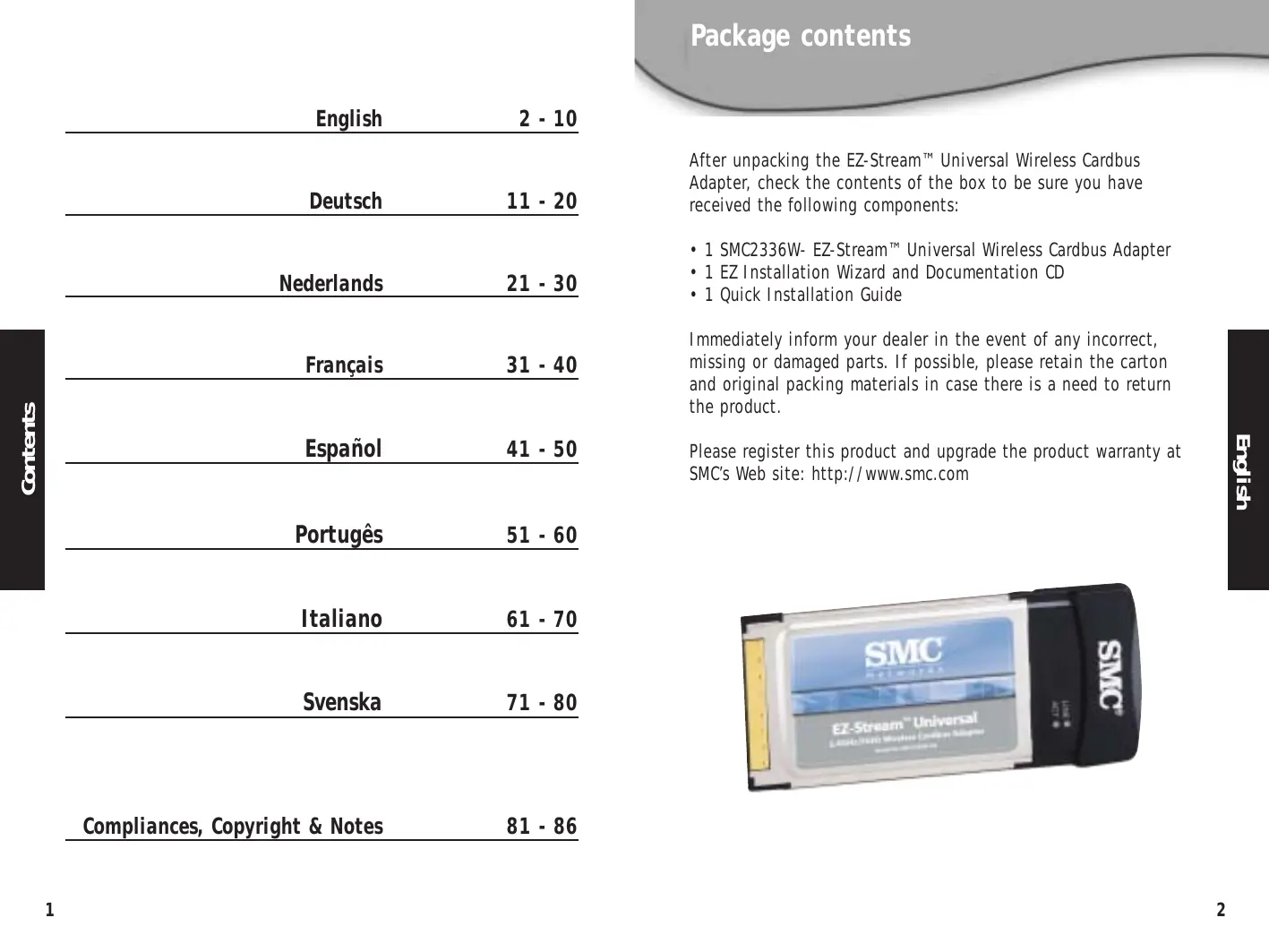 Gntents English 2-10 Deutsch 11-20 Nederlands 21-30 Français 31-40 Español 41-50 Portugês 51-60 Italiano 61-70 Svenska 11-80 Compliances, Copyright & Notes 81 - 86 Package contents After unpacking the EZ-Stream" Universal Wireless Cardbus Adapter, check the contents of the box to be sure you have received the following components: + 1 SMC2336W- EZ-Stream"” Universal Wireless Cardbus Adapter