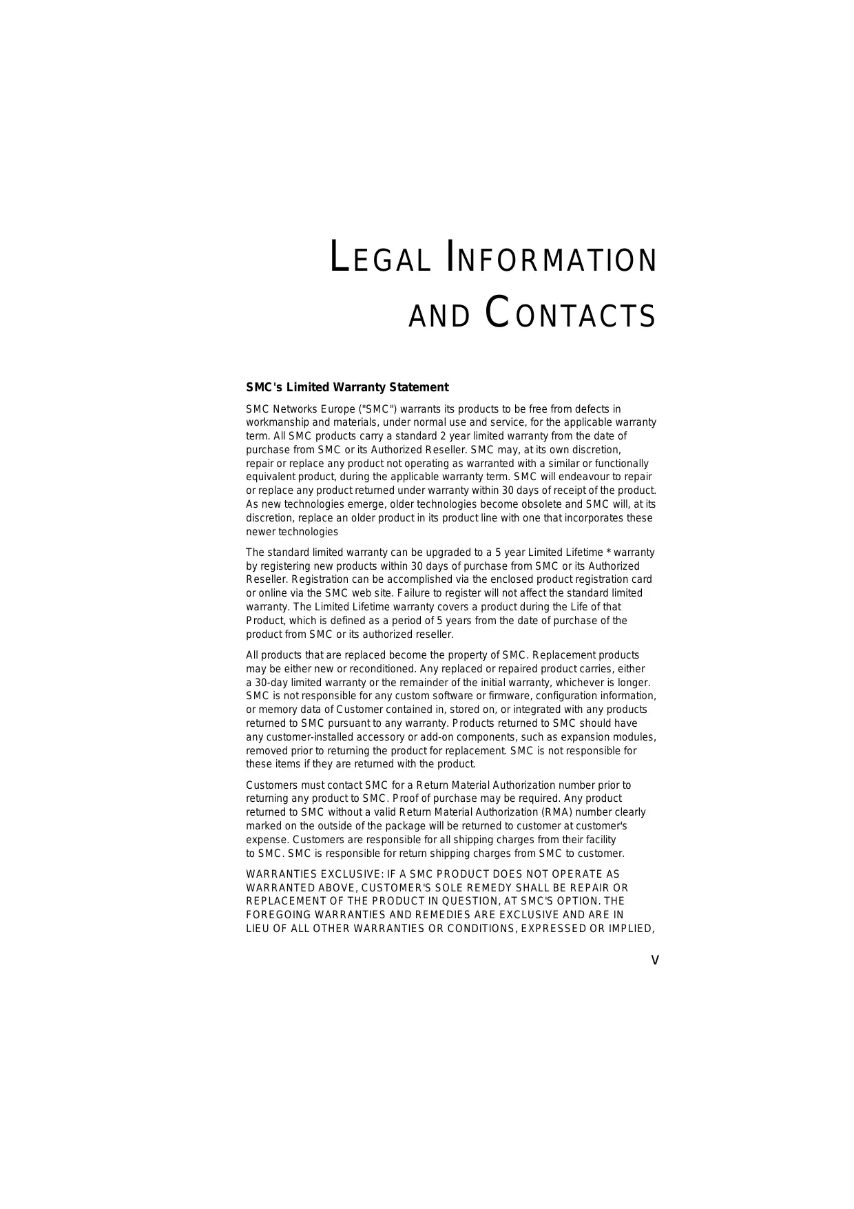 EN60950 geprüft ist. Ausgangswerte der Stromversorgung sollten die Werte von AC 7,5-8V, 50-60Hz nicht über- oder unterschreiten sowie den minimalen Strom von 1A nicht unterschreiten. Der arbeitsplatzbezogene Schalldruckpegel nach DIN 45 635 Teil 1000 beträgt 70dB(A) oder weniger. iii LEGAL INFORMATION AND CONTACTS SMC's Limited Warranty Statement SMC Networks Europe ("SMC") warrants its products to be free from defects in workmanship and materials, under normal use and service, for the applicable warranty term. All SMC products carry a standard 2 year limited warranty from the date of purchase from SMC or its Authorized Reseller. SMC may, at its own discretion, repair or replace any product not operating as warranted with a similar or functionally equivalent product, during the applicable warranty term. SMC will endeavour to repair or replace any product returned under warranty within 30 days of receipt of the product. As new technologies emerge, older technologies become obsolete and SMC will, at its discretion, replace an older product in its product line with one that incorporates these newer technologies The standard limited warranty can be upgraded to a 5 year Limited Lifetime * warranty by registering new products within 30 days of purchase from SMC or its Authorized Reseller. Registration can be accomplished via the enclosed product registration card or online via the SMC web site. Failure to register will not affect the standard limited warranty. The Limited Lifetime warranty covers a product during the Life of that Product, which is defined as a period of 5 years from the date of purchase of the product from SMC or its authorized reseller. All products that are replaced become the property of SMC. Replacement products may be either new or reconditioned. Any replaced or repaired product carries, either a 30-day limited warranty or the remainder of the initial warranty, whichever is longer. SMC is not responsible for any custom software or firmware, configuration information, or memory data of Customer contained in, stored on, or integrated with any products returned to SMC pursuant to any warranty. Products returned to SMC should have any customer-installed accessory or add-on components, such as expansion modules, removed prior to returning the product for replacement. SMC is not responsible for these items if they are returned with the product. Customers must contact SMC for a Return Material Authorization number prior to returning any product to SMC. Proof of purchase may be required. Any product returned to SMC without a valid Return Material Authorization (RMA) number clearly marked on the outside of the package will be returned to customer at customer's expense. Customers are responsible for all shipping charges from their facility to SMC. SMC is responsible for return shipping charges from SMC to customer. WARRANTIES EXCLUSIVE: IF A SMC PRODUCT DOES NOT OPERATE AS WARRANTED ABOVE, CUSTOMER'S SOLE REMEDY SHALL BE REPAIR OR REPLACEMENT OF THE PRODUCT IN QUESTION, AT SMC'S OPTION. THE FOREGOING WARRANTIES AND REMEDIES ARE EXCLUSIVE AND ARE IN LIEU OF ALL OTHER WARRANTIES OR CONDITIONS, EXPRESSED OR IMPLIED,