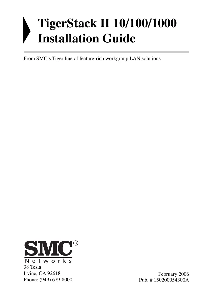 ) TigerStack II 10/100/1000 Installation Guide From SMC"Ss Tiger line of feature-rich workgroup LAN solutions SMC Networks 38 Tesla Irvine, CA 92618 February 2006 Phone: (949) 679-8000 Pub. # 150200054300A