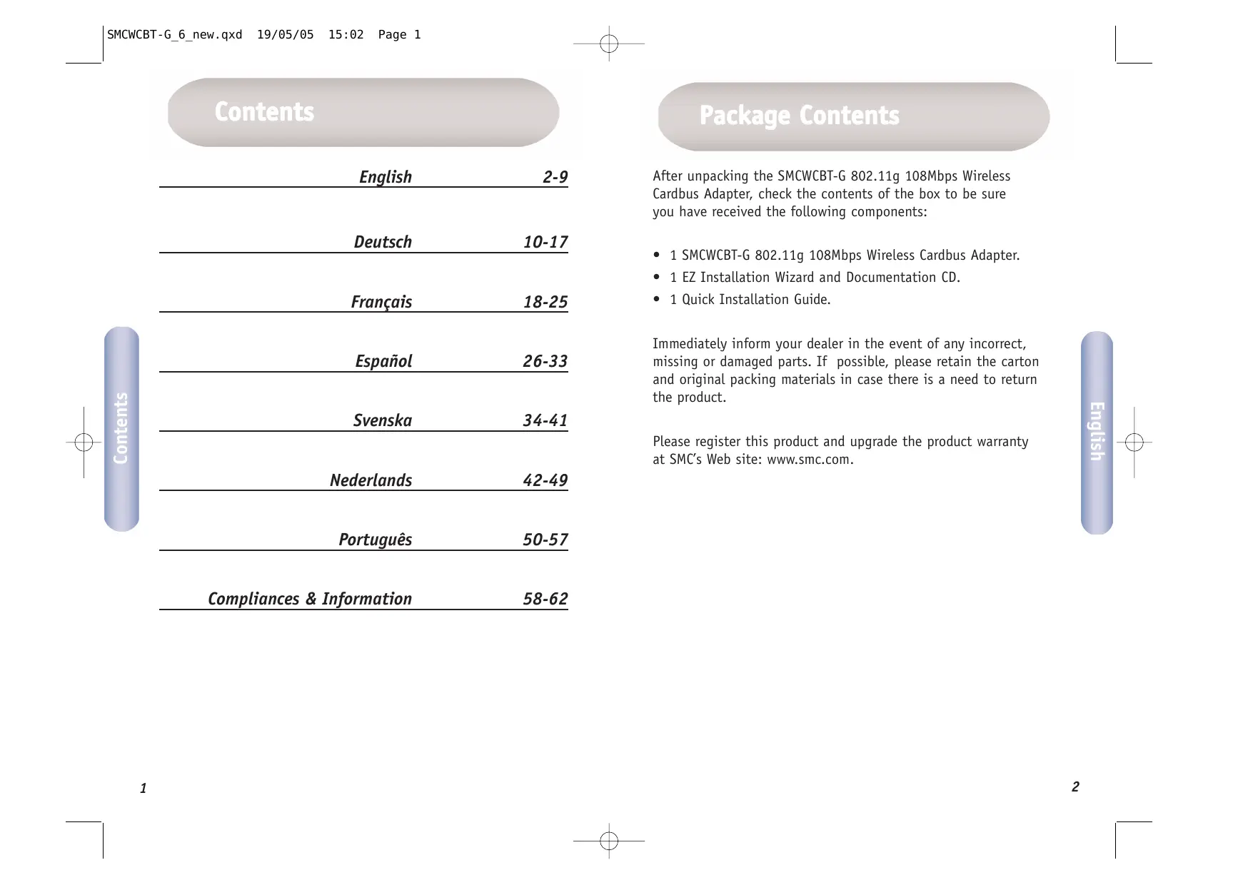 SMCWCBT-G_6_new.qxd 19/05/05 15:02 Page 1 English 2-9 Deutsch 10-17 Français 18-25 Español 26-33 Svenska 34-41 Nederlands 42-49 Português 50-57 Compliances & Information 58-62 After unpacking the SMCWCBT-G 802.11g 108Mbps Wireless Cardbus Adapter, check the contents of the box to be sure you have received the following components: + _1 SMCWCBT-G 802.11g 108Mbps Wireless Cardbus Adapter. + 1 EZ Installation Wizard and Documentation CD. + 1 Quick Installation Guide. Immediately inform your dealer in the event of any incorrect, missing or damaged parts. If possible, please retain the carton and original packing materials in case there is a need to return the product. Please register this product and upgrade the product warranty at SMC's Web site: www.smc.com.