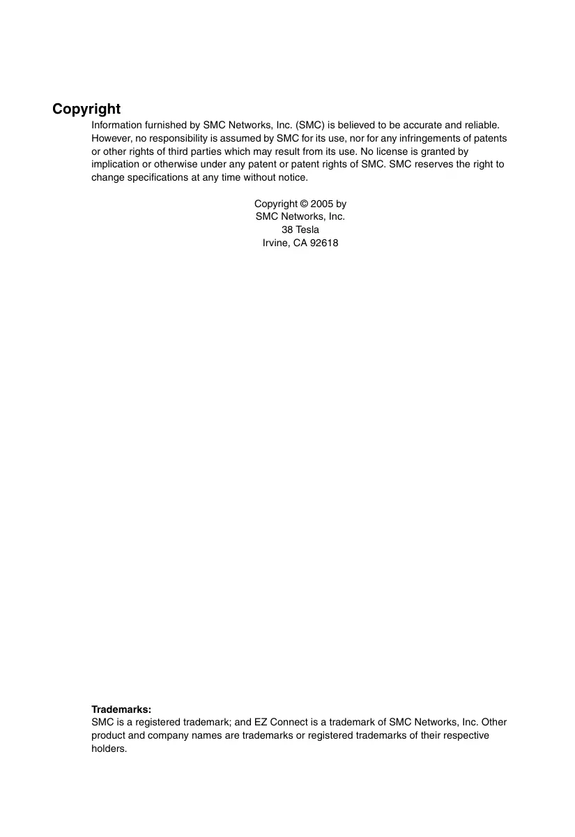 Copyright Information furnished by SMC Networks, Inc. (SMC) is believed to be accurate and reliable. However, no responsibility is assumed by SMC for its use, nor for any infringements of patents or other rights of third parties which may result from its use. No license is granted by implication or otherwise under any patent or patent rights of SMC. SMC reserves the right to change specifications at any time without notice. Copyright © 2005 by SMC Networks, Inc. 88 Tesla Irvine, CA 92618 Trademarks: SMC is a registered trademark; and EZ Connect is a trademark of SMC Networks, Inc. Other product and company names are trademarks or registered trademarks of their respective holders.