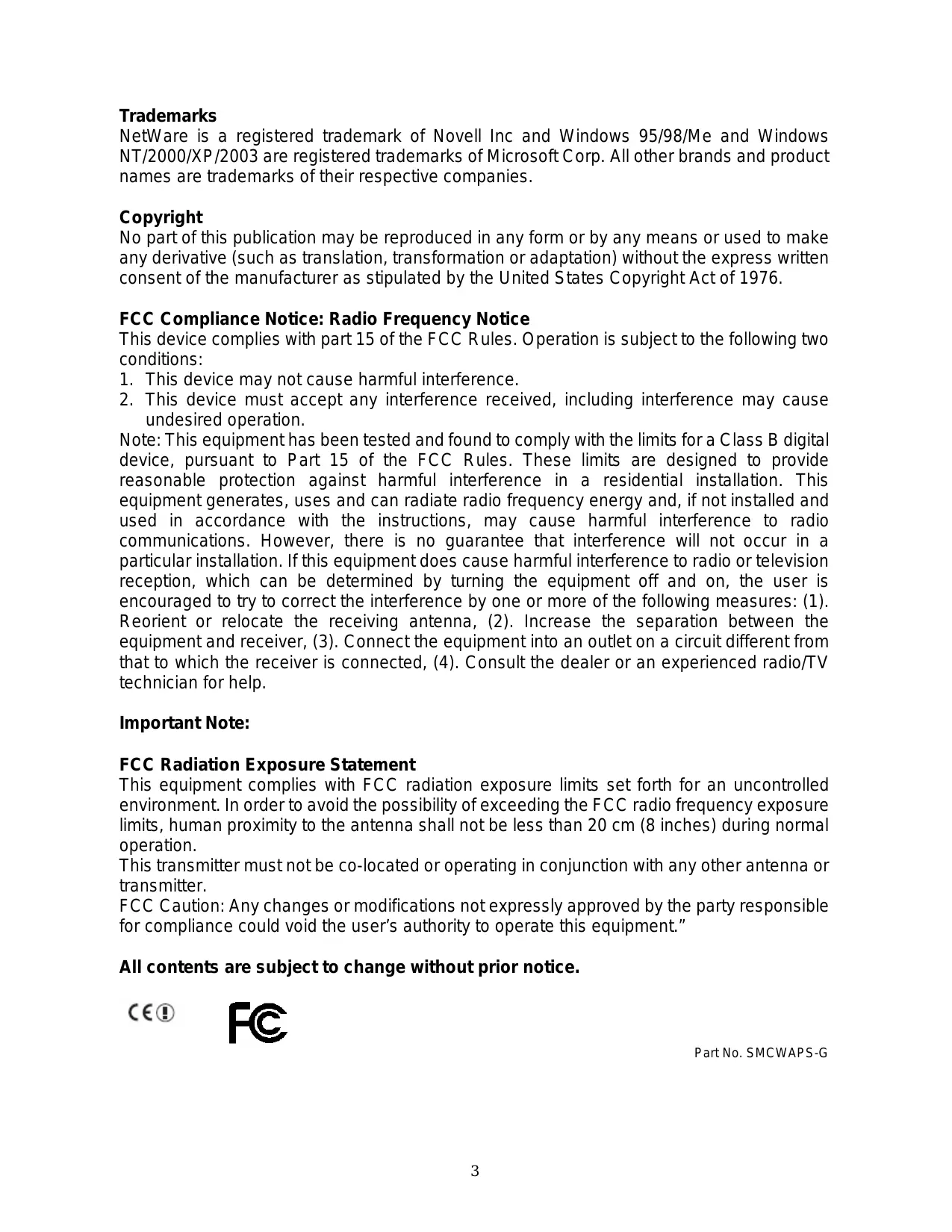 undesired operation. Note: This equipment has been tested and found to comply with the limits for a Class B digital device, pursuant to Part 15 of the FCC Rules. These limits are designed to provide reasonable protection against harmful interference in a residential installation. This equipment generates, uses and can radiate radio frequency energy and, if not installed and used in accordance with the instructions, may cause harmful interference to radio communications. However, there is no guarantee that interference will not occur in a particular installation. If this equipment does cause harmful interference to radio or television reception, which can be determined by turning the equipment off and on, the user is encouraged to try to correct the interference by one or more of the following measures: (1). Reorient or relocate the receiving antenna, (2). Increase the separation between the equipment and receiver, (3). Connect the equipment into an outlet on a circuit different from that to which the receiver is connected, (4). Consult the dealer or an experienced radio/TV technician for help. Important Note: FCC Radiation Exposure Statement This equipment complies with FCC radiation exposure limits set forth for an uncontrolled environment. In order to avoid the possibility of exceeding the FCC radio frequency exposure limits, human proximity to the antenna shall not be less than 20 cm (8 inches) during normal operation. This transmitter must not be co-located or operating in conjunction with any other antenna or transmitter. FCC Caution: Any changes or modifications not expressly approved by the party responsible for compliance could void the user's authority to operate this equipment.” All contents are subject to change without prior notice. (440) FE Part No. SMCWAPS-G