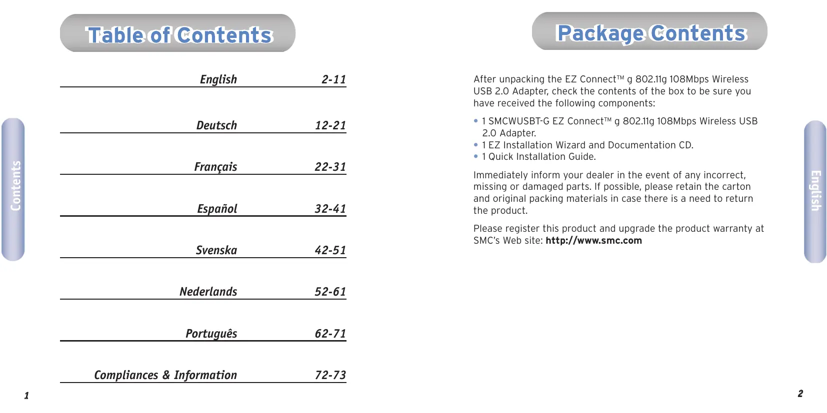 - 1 Quick Installation Guide. English English Immediately inform your dealer in the event of any incorrect, missing or damaged parts. If possible, please retain the carton and original packing materials in case there is a need to return the product. Please register this product and upgrade the product warranty at SMC’s Web site: http://www.smc.com