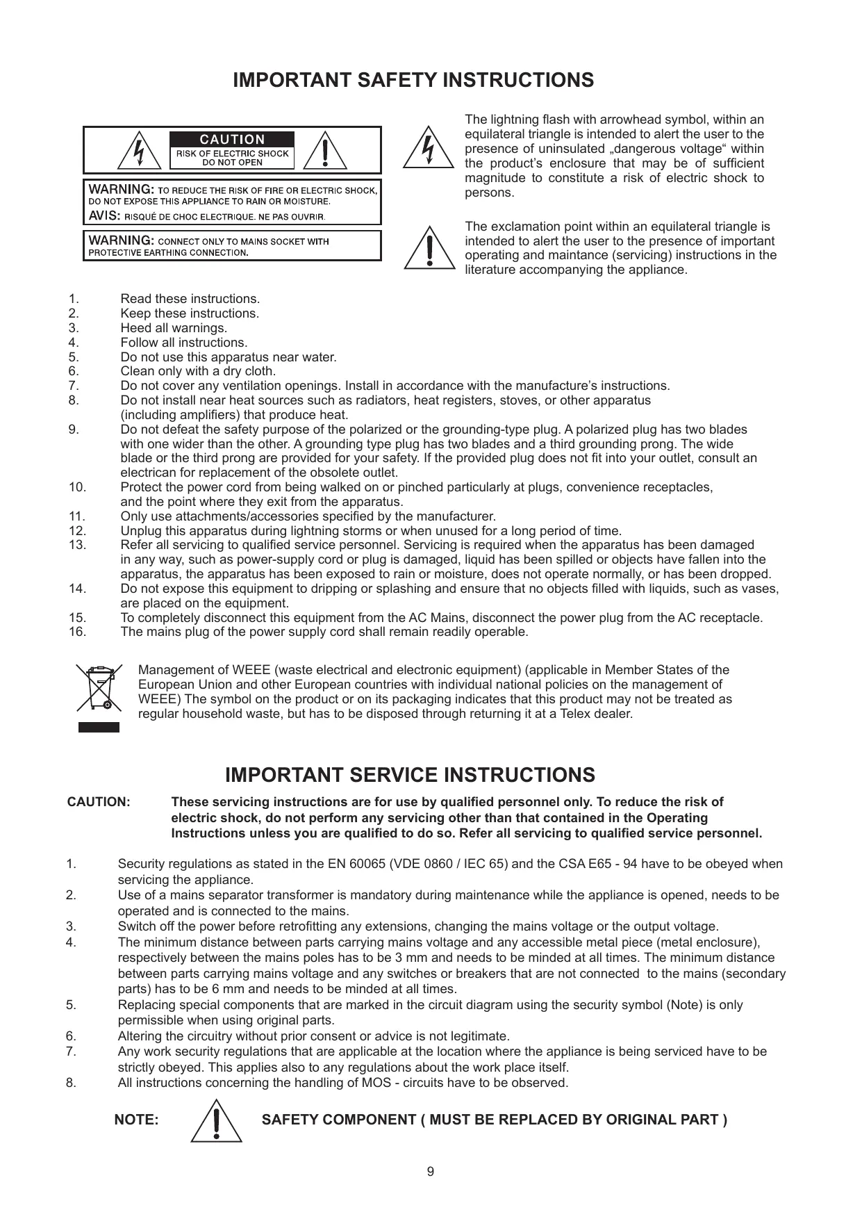 Read these instructions. Keep these instructions. Heed all warnings. Follow all instructions. Do not use this apparatus near water. Clean only with a dry cloth. Do not cover any ventilation openings. Install in accordance with the manufacture’s instructions. Do not install near heat sources such as radiators, heat registers, stoves, or other apparatus (including amplifiers) that produce heat. Do not defeat the safety purpose of the polarized or the grounding-type plug. A polarized plug has two blades with one wider than the other. A grounding type plug has two blades and a third grounding prong. The wide blade or the third prong are provided for your safety. If the provided plug does not fit into your outlet, consult an electrican for replacement of the obsolete outlet. Protect the power cord from being walked on or pinched particularly at plugs, convenience receptacles, and the point where they exit from the apparatus. Only use attachments/accessories specified by the manufacturer. Unplug this apparatus during lightning storms or when unused for a long period of time. Refer all servicing to qualified service personnel. Servicing is required when the apparatus has been damaged in any way, such as power-supply cord or plug is damaged, liquid has been spilled or objects have fallen into the apparatus, the apparatus has been exposed to rain or moisture, does not operate normally, or has been dropped. Do not expose this equipment to dripping or splashing and ensure that no objects filled with liquids, such as vases, are placed on the equipment. To completely disconnect this equipment from the AC Mains, disconnect the power plug from the AC receptacle. The mains plug of the power supply cord shall remain readily operable. Management of WEEE (waste electrical and electronic equipment) (applicable in Member States of the European Union and other European countries with individual national policies on the management of WEEE) The symbol on the product or on its packaging indicates that this product may not be treated as regular household waste, but has to be disposed through returning it at a Telex dealer.