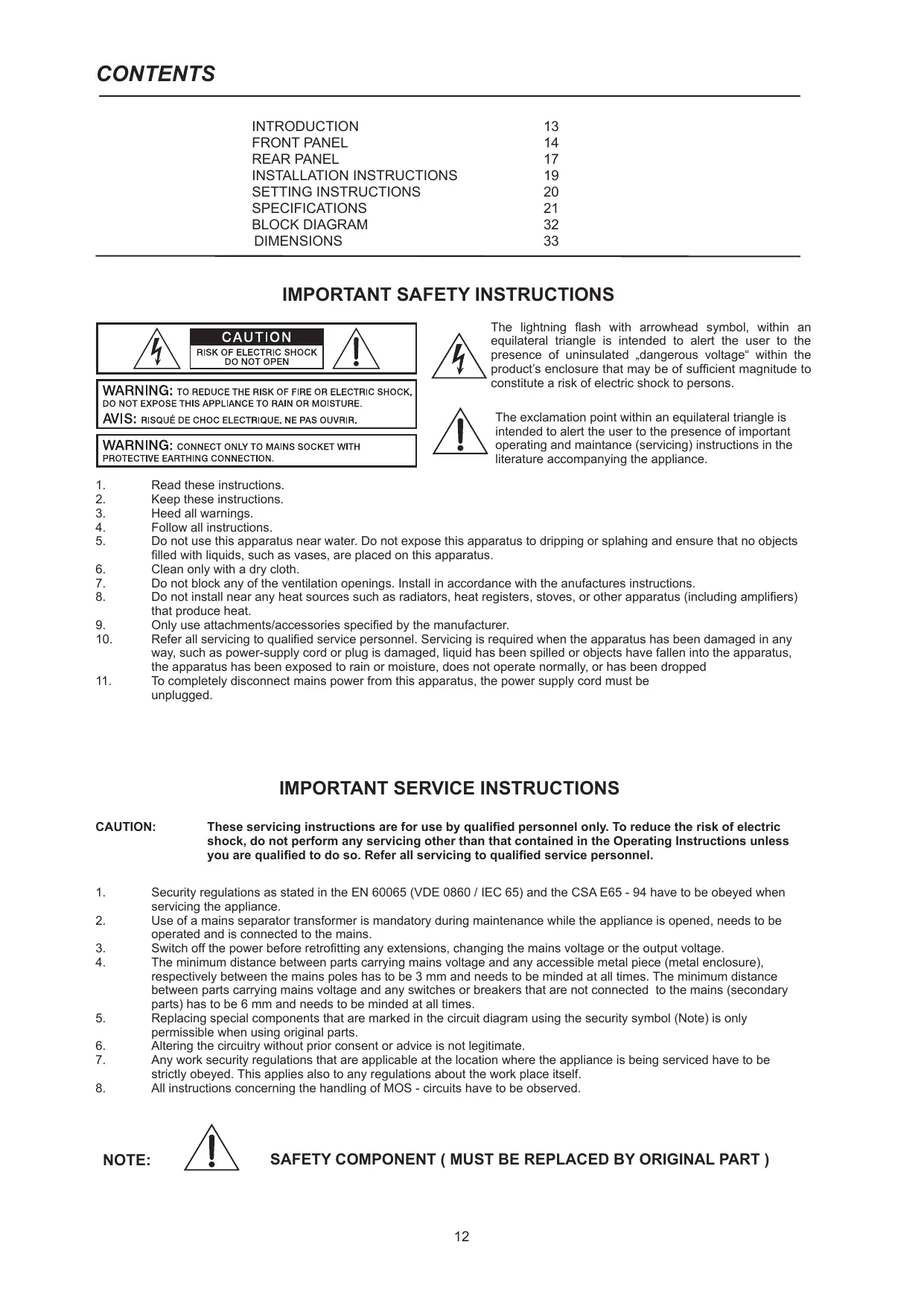 NOTE: These servicing instructions are for use by qualified personnel only. To reduce the risk of electric shock, do not perform any servicing other than that contained in the Operating Instructions unless you are qualified to do so. Refer all servicing to qualified service personnel. Security regulations as stated in the EN 60065 (VDE 0860 / IEC 65) and the CSA E65 - 94 have to be obeyed when servicing the appliance. Use of a mains separator transformer is mandatory during maintenance while the appliance is opened, needs to be operated and is connected to the mains. Switch off the power before retrofitting any extensions, changing the mains voltage or the output voltage. The minimum distance between parts carrying mains voltage and any accessible metal piece (metal enclosure), respectively between the mains poles has to be 3 mm and needs to be minded at all times. The minimum distance between parts carrying mains voltage and any switches or breakers that are not connected to the mains (secondary parts) has to be 6 mm and needs to be minded at all times. Replacing special components that are marked in the circuit diagram using the security symbol (Note) is only permissible when using original parts. Altering the circuitry without prior consent or advice is not legitimate. Any work security regulations that are applicable at the location where the appliance is being serviced have to be strictly obeyed. This applies also to any regulations about the work place itself. All instructions concerning the handling of MOS - circuits have to be observed. SAFETY COMPONENT ( MUST BE REPLACED BY ORIGINAL PART )