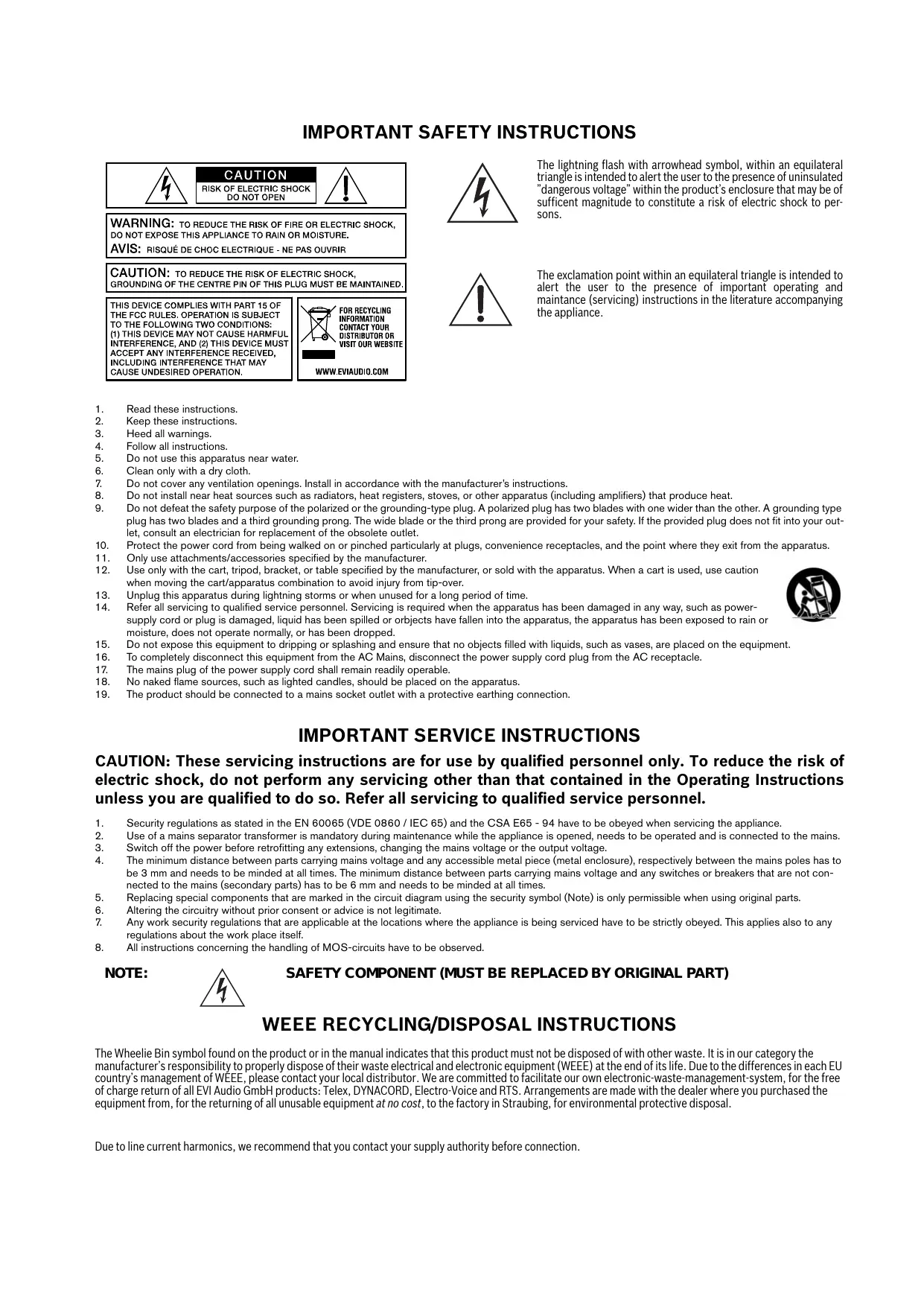 The lightning flash with arrowhead symbol, within an equilateral triangle is intended to alert the user to the presence of uninsulated ”dangerous voltage” within the product’s enclosure that may be of sufficent magnitude to constitute a risk of electric shock to persons. The exclamation point within an equilateral triangle is intended to alert the user to the presence of important operating and maintance (servicing) instructions in the literature accompanying the appliance.