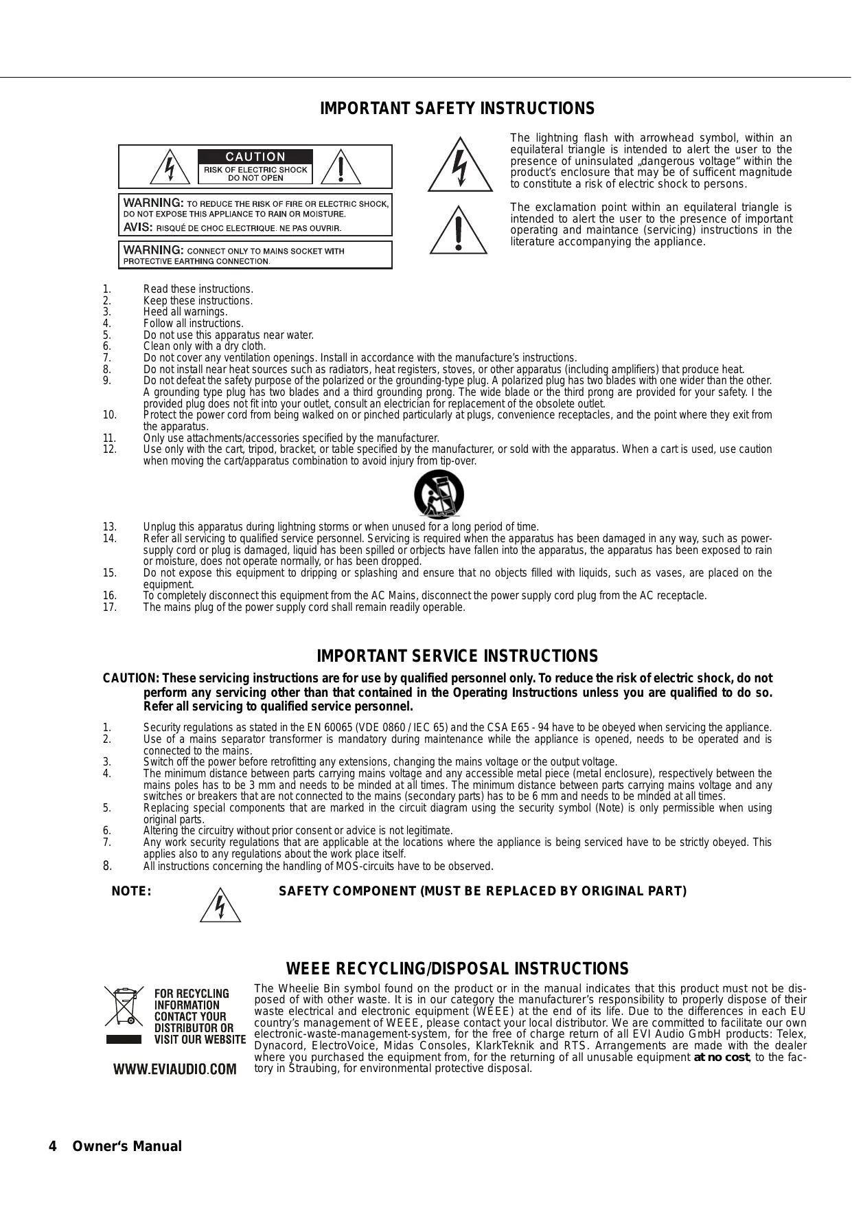 CONTACT YOUR waste electrical and electronic equipment (WÉEE) at the end of its life. Due to the differences in each EU DISTRIBUTOR OR County's management of WEEE, please contact your local distributor. We are committed to facilitate our own VISIT OUR WEBSITE €lectronic-waste-management-system, for the free of charge retum of all EVI Audio GmbH products: Telex, Dynacord, ElectroVoice. Midas Consoles, KlerkTeknik and RTS. Arrangements are made with the dealer where you purchased the equipment from, for the retuming of all unusable equipment at no cost to the fac- WWWL.EVIAUDIO.COM … tory in Straubing, for environmental protecäve disposal. 4 Owner‘s Manual