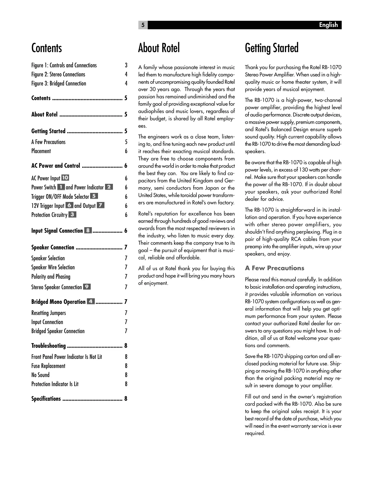 About Rotel Getting Started A family whose passionate interest in music led them to manufacture high fidelity components of uncompromising quality founded Rotel over 30 years ago. Through the years that passion has remained undiminished and the family goal of providing exceptional value for audiophiles and music lovers, regardless of their budget, is shared by all Rotel employees. Thank you for purchasing the Rotel RB-1070 Stereo Power Amplifier. When used in a highquality music or home theater system, it will provide years of musical enjoyment. The engineers work as a close team, listening to, and fine tuning each new product until it reaches their exacting musical standards. They are free to choose components from around the world in order to make that product the best they can. You are likely to find capacitors from the United Kingdom and Germany, semi conductors from Japan or the United States, while toroidal power transformers are manufactured in Rotel’s own factory. Rotel’s reputation for excellence has been earned through hundreds of good reviews and awards from the most respected reviewers in the industry, who listen to music every day. Their comments keep the company true to its goal – the pursuit of equipment that is musical, reliable and affordable. All of us at Rotel thank you for buying this product and hope it will bring you many hours of enjoyment. The RB-1070 is a high-power, two-channel power amplifier, providing the highest level of audio performance. Discrete output devices, a massive power supply, premium components, and Rotel’s Balanced Design ensure superb sound quality. High current capability allows the RB-1070 to drive the most demanding loudspeakers. Be aware that the RB-1070 is capable of high power levels, in excess of 130 watts per channel. Make sure that your speakers can handle the power of the RB-1070. If in doubt about your speakers, ask your authorized Rotel dealer for advice. The RB-1070 is straightforward in its installation and operation. If you have experience with other stereo power amplifiers, you shouldn’t find anything perplexing. Plug in a pair of high-quality RCA cables from your preamp into the amplifier inputs, wire up your speakers, and enjoy. A Few Precautions Troubleshooting ..................................... 8 Please read this manual carefully. In addition to basic installation and operating instructions, it provides valuable information on various RB-1070 system configurations as well as general information that will help you get optimum performance from your system. Please contact your authorized Rotel dealer for answers to any questions you might have. In addition, all of us at Rotel welcome your questions and comments. Front Panel Power Indicator Is Not Lit Fuse Replacement No Sound Protection Indicator Is Lit Save the RB-1070 shipping carton and all enclosed packing material for future use. Shipping or moving the RB-1070 in anything other than the original packing material may result in severe damage to your amplifier. Bridged Mono Operation