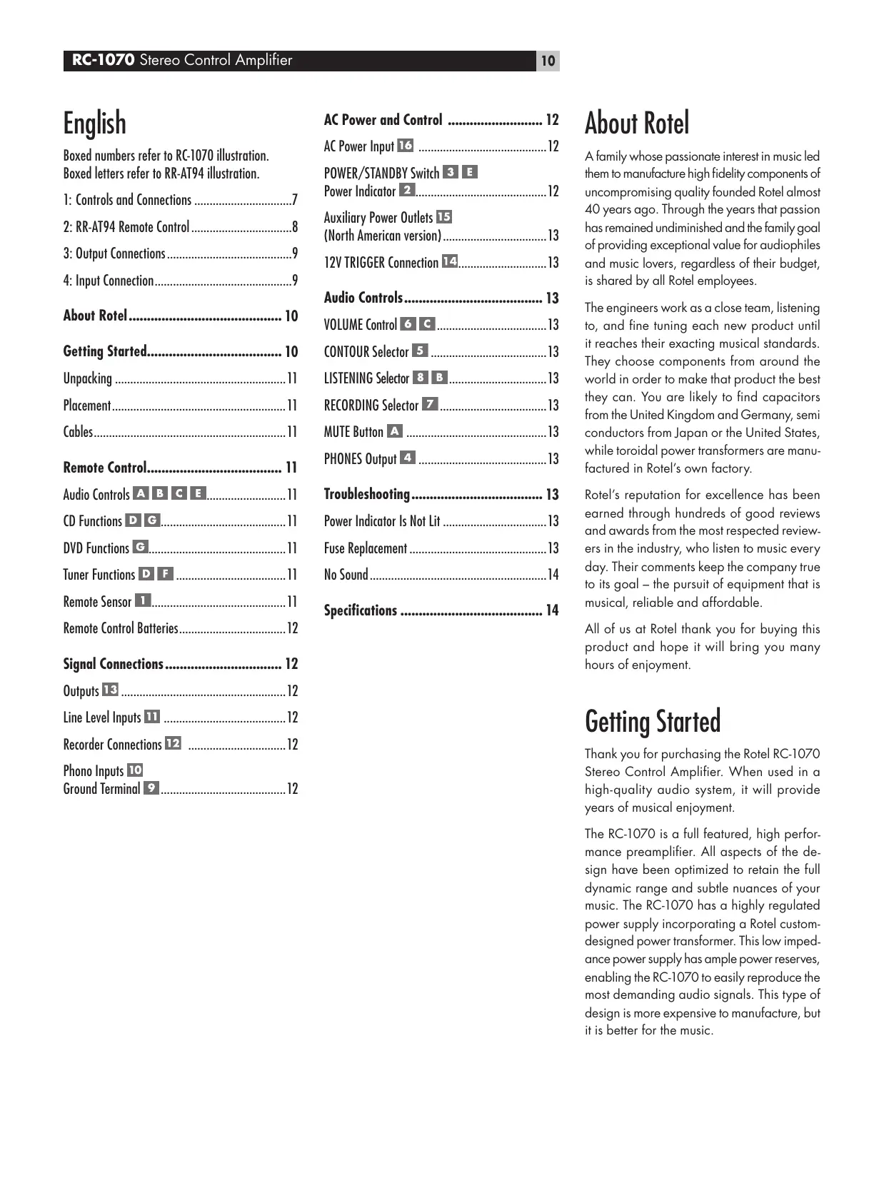 Please read this manual carefully. It provides complete information on how to incorporate the RC-1070 into your system as well as general information that will help you get optimum performance. Please contact your authorized Rotel dealer for answers to any questions. In addition, all of us at Rotel welcome your questions and comments.