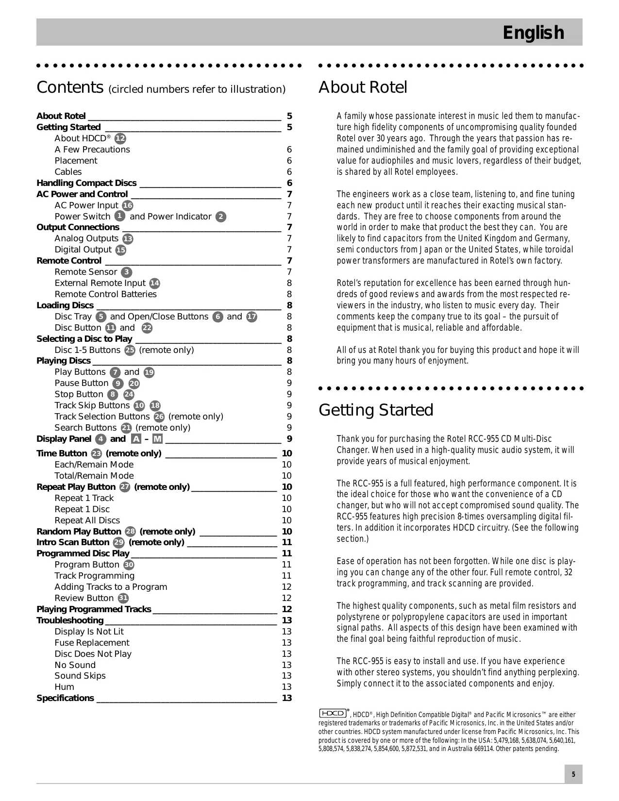 A family whose passionate interest in music led them to manufacture high fidelity components of uncompromising quality founded Rotel over 30 years ago. Through the years that passion has remained undiminished and the family goal of providing exceptional value for audiophiles and music lovers, regardless of their budget, is shared by all Rotel employees. The engineers work as a close team, listening to, and fine tuning each new product until it reaches their exacting musical standards. They are free to choose components from around the world in order to make that product the best they can. You are likely to find capacitors from the United Kingdom and Germany, semi conductors from Japan or the United States, while toroidal power transformers are manufactured in Rotel’s own factory. Rotel’s reputation for excellence has been earned through hundreds of good reviews and awards from the most respected reviewers in the industry, who listen to music every day. Their comments keep the company true to its goal – the pursuit of equipment that is musical, reliable and affordable. All of us at Rotel thank you for buying this product and hope it will bring you many hours of enjoyment. ○ ○ ○ ○ ○ ○ ○ ○ ○ ○ ○ ○ ○ ○ ○ ○ ○ ○ ○ ○ ○ ○ ○ ○ ○ ○ ○ ○ ○ ○ ○ ○ ○ Getting Started Thank you for purchasing the Rotel RCC-955 CD Multi-Disc Changer. When used in a high-quality music audio system, it will provide years of musical enjoyment. The RCC-955 is a full featured, high performance component. It is the ideal choice for those who want the convenience of a CD changer, but who will not accept compromised sound quality. The RCC-955 features high precision 8-times oversampling digital filters. In addition it incorporates HDCD circuitry. (See the following section.) Ease of operation has not been forgotten. While one disc is playing you can change any of the other four. Full remote control, 32 track programming, and track scanning are provided. The highest quality components, such as metal film resistors and polystyrene or polypropylene capacitors are used in important signal paths. All aspects of this design have been examined with the final goal being faithful reproduction of music. The RCC-955 is easy to install and use. If you have experience with other stereo systems, you shouldn’t find anything perplexing. Simply connect it to the associated components and enjoy. , HDCD® , High Definition Compatible Digital® and Pacific Microsonics™ are either registered trademarks or trademarks of Pacific Microsonics, Inc. in the United States and/or other countries. HDCD system manufactured under license from Pacific Microsonics, Inc. This product is covered by one or more of the following: In the USA: 5,479,168, 5,638,074, 5,640,161, 5,808,574, 5,838,274, 5,854,600, 5,872,531, and in Australia 669114. Other patents pending.