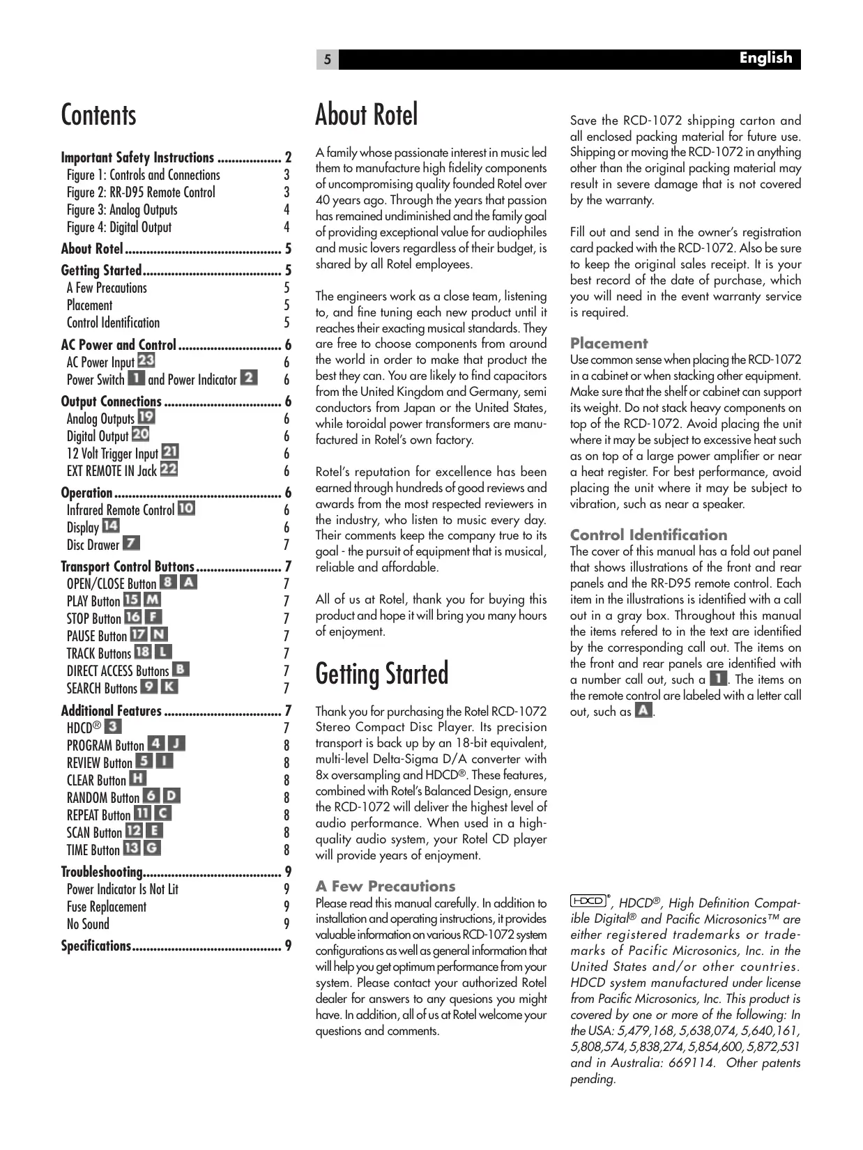 Transport Control Button: OPEN/CLOSE Button EN EN PLAY Button EE STOP Button LEE PAUSE Button LEA CI TRACK Buttons LEX EN DIRECT ACCESS Buttons EX SEARCH Buttons EX LA Additional Features … #c© EX PROGRAM Button EX EN REVIEW Button EX ER CLEAR Button LI RANDOM Button KA EX REPEAT Button LI EN SCAN Button LE] ER TIME Button EI CA Troubleshooting. Power Indicator Is Not Lit Fuse Replacement No Sound Specifications. ST EN About Rotel A family whose passionate interest in music led them to manufacture high fidelity components of uncompromising quality founded Rotel over 40 years ago. Through the years that passion has remained undiminished and the family goal of providing exceptional value for audiophiles and music lovers regardlless of their budget, is shared by all Rotel employees. The engineers work as a close team, listening to, and fine tuning each new product until it reaches their exacting musical standardks. They are free to choose components from around the world in order to make that product the bestthey can. You are likely to find capacitors from the United Kingdom and Germany, semi conductors from Japan or the United States, while toroidal power transformers are manu- factured in Rotel's own factory. Rotel's reputation for excellence has been earned through hundreds of good reviews and awards from the most respected reviewers in the industry, who listen to music every day. Their comments keep the company true to its goal - the pursuit of equipment that is musical, reliable and affordable. All of us at Rotel, thank you for buying this product and hope it will bring you many hours of enjoyment. Getting Started Thank you for purchasing the Rotel RCD-1072 Stereo Compact Disc Player. lts precision transport is back up by an 18-bit equivalent, multi-level Delta-Sigma D/A converter with 8x oversampling and HDCD®. These features, combined with Rotel Balanced Design, ensure the RCD-1072 will deliver the highest level of audio performance. When used in a high- quality audio system, your Rotel CD player will provide years of enjoyment. A Few Precautions Please read this manual carefully. In addition to installation and operating instructions, it provides valuable information on various RCD-1072 system configurations as well as general information that willhelp you get optimum performance from your system. Please contact your authorized Rotel dealer for answers to any quesions you might have. In addition, all of us at Rotel welcome your questions and comments. Save the RCD-1072 shipping carton and all enclosed packing material for future use. Shipping or moving the RCD-1072 in anything other than the original packing material may result in severe damage that is not covered by the warranty. Fill out and send in the owners registration card packed with the RCD-1072. Also be sure to keep the original sales receipt. It is your best record of the date of purchase, which you will need in the event warranty service is required. Placement Use common sense when placing the RCD-1072 in a cabinet or when stacking other equipment. Make sure thatthe shelf or cabinet can support its weight. Do not stack heavy components on top of the RCD-1072. Avoid placing the unit where it may be subject to excessive heat such as on top of a large power amplifier or near a heat register. For best performance, avoid placing the unit where it may be subject to vibration, such as near a speaker. Control Identification The cover of this manual has a fold out panel that shows illustrations of the front and rear panels and the RR-D95 remote control. Each item in the illustrations is identified with a call out in a gray box. Throughout this manual the items refered to in the text are identified by the corresponding call out. The items on the front and rear panels are identified with a number call out, such a EL The items on the remote control are labeled with a letter call out, such as EN. CSS), HDCD®, High Definition Compat- ible Digital® and Pacific Microsonics"" are either registered trademarks or trade- marks of Pacific Microsonics, Inc. in the United States and/or other countries. HDCD system manufactured under license from Pacific Microsonics, Inc. This product is covered by one or more of the following: In the USA: 5,479,168, 5,638,074, 5,640,161, 5,808 574, 5,838,274, 5,854,600, 5,872,531 and in Australia: 669114. Other patents pending.