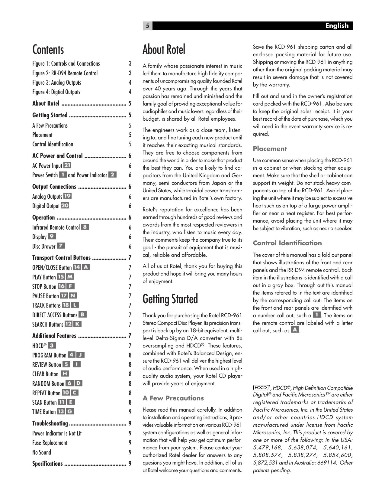 About Rotel .......................................... 5 Getting Started ..................................... 5 A Few Precautions Placement Control Identification