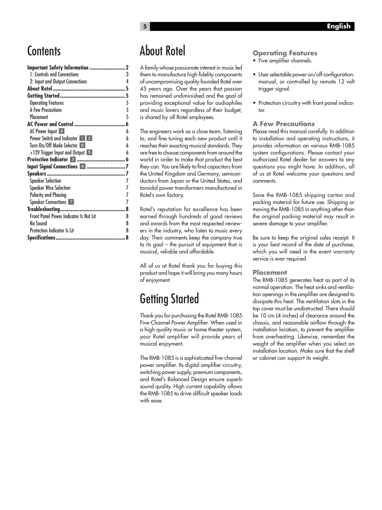 - Front Panel Power Indicator Is Not Lit No Sound Protection Indicator Is Lit Specifications A family whose passionate interest in music led them to manufacture high fidelity components of uncompromising quality founded Rotel over 45 years ago. Over the years that passion has remained undiminished and the goal of providing exceptional value for audiophiles and music lovers regardless of their budget, is shared by all Rotel employees. The engineers work as a close team, listening to, and fine tuning each new product until it reaches their exacting musical standards. They are free to choose components from around the world in order to make that product the best they can. You are likely to find capacitors from the United Kingdom and Germany, semiconductors from Japan or the United States, and toroidal power transformers manufactured in Rotel’s own factory. Rotel’s reputation for excellence has been earned through hundreds of good reviews and awards from the most respected reviewers in the industry, who listen to music every day. Their comments keep the company true to its goal – the pursuit of equipment that is musical, reliable and affordable. All of us at Rotel thank you for buying this product and hope it will bring you many hours of enjoyment. Getting Started Thank you for purchasing the Rotel RMB-1085 Five-Channel Power Amplifier. When used in a high-quality music or home theater system, your Rotel amplifier will provide years of musical enjoyment. The RMB-1085 is a sophisticated five-channel power amplifier. Its digital amplifier circuitry, switching power supply, premium components, and Rotel’s Balanced Design ensure superb sound quality. High current capability allows the RMB-1085 to drive difficult speaker loads with ease. Operating Features p. 8