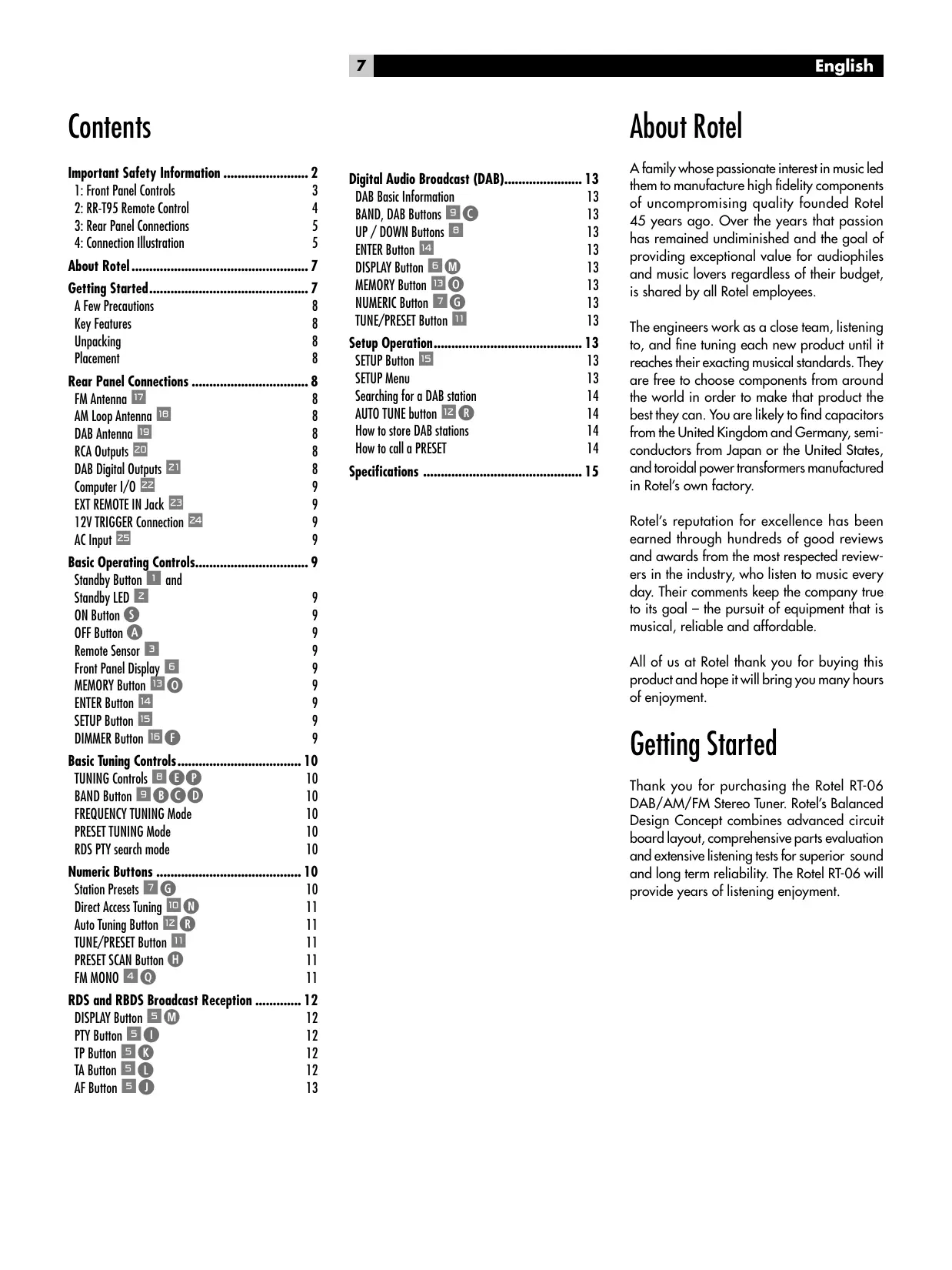 Thank you for purchasing the Rotel RT-06 DAB/AM/FM Stereo Tuner. Rotel’s Balanced Design Concept combines advanced circuit board layout, comprehensive parts evaluation and extensive listening tests for superior sound and long term reliability. The Rotel RT-06 will provide years of listening enjoyment.