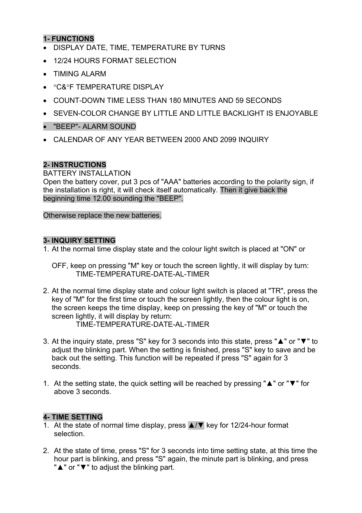 BATTERY INSTALLATION Open the battery cover, put 3 pcs of "AAA" batteries according to the polarity sign, if the installation is right, it will check itself automatically. Mhen:it give back the beginning time 12.00 sounding the "BEEP". Otherwise replace the new batteries.