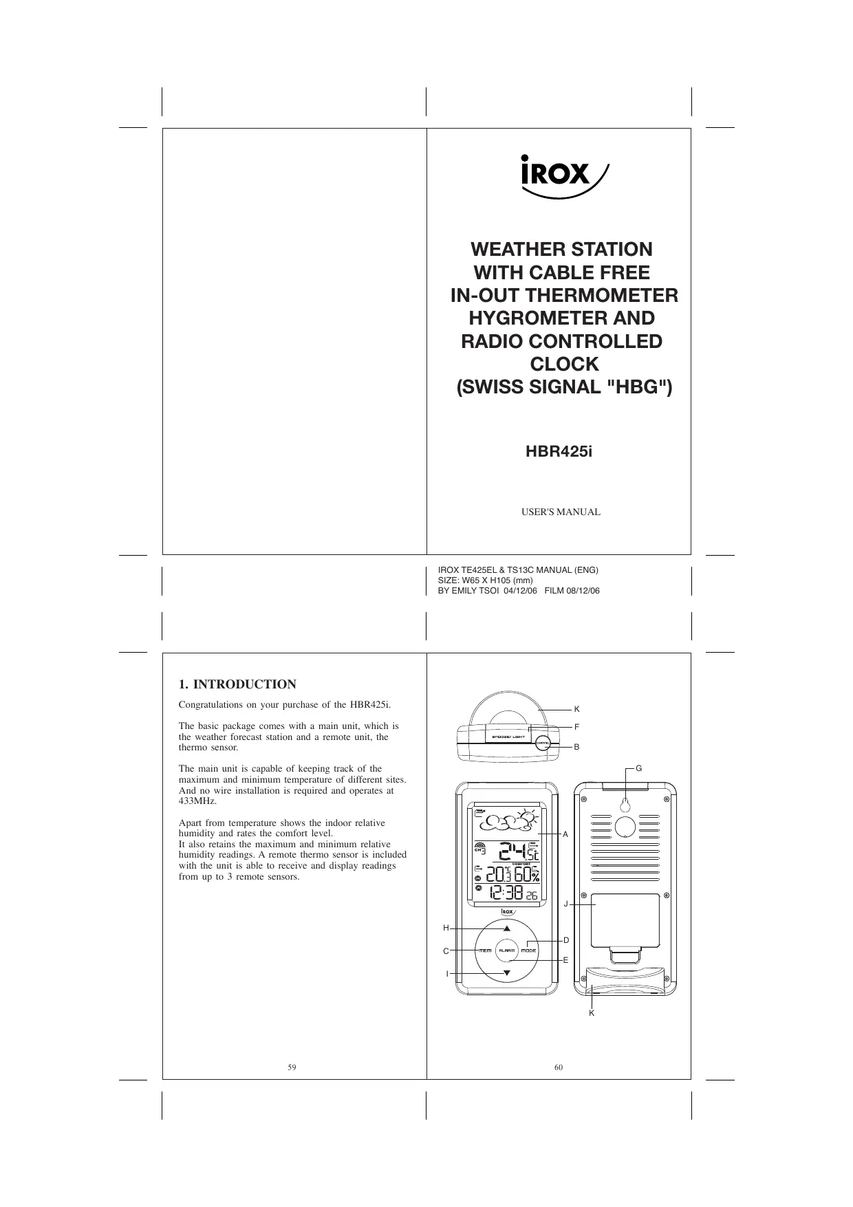 HBR425I - Weather Station IROX - Free user manual and instructions