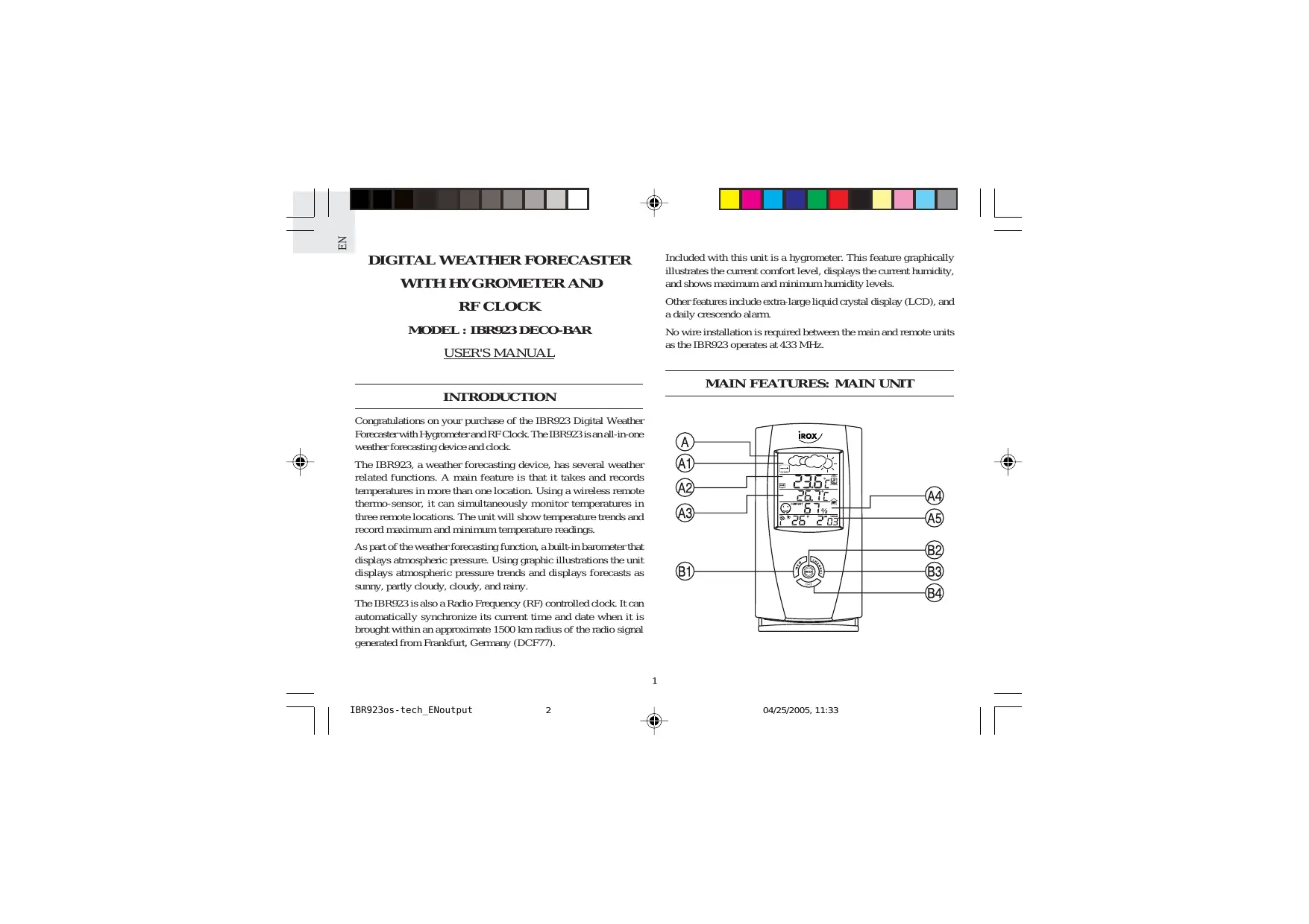 RF CLOCK MODEL : DECO-BAR USER'S MANUAL INTRODUCTION Congratulations on your purchase of the IBR923 Digital Weather Forecaster with Hycromster and RF Clodk The IBR923s anall-in-one westher forecasting device and clock. The IBR923, a weather forecasting device, has several weather related functions. À main feature is that it takes and records temperatures in more than one location. Using a wireless remote thermo-sensor, it can simultaneously monitor temperatures in. three remote locations, The unit will show temperature trends and record maximum and minimum temperature readings. As pat of the weather forecasting function, a built in barometer that: displays atmosphere pressure, Using graphic illustrations the unit. displays atmosphere pressure trends and displays forecasts as sumny, partiy oudy, Goudy, and rainy. TheTBR923 is also a Radio Frequency (RF) controlled dock. It can automatically synchronize its current time and date when it is brought within an approximate 1500 km radis of the radio signal generated from Frankfurt, Germany (DCF77). Included with this unit is à hygrometer, This feature graphically illustrates the current comfort level, displays the current humidity, and shows maximum and minimum humidity levels. Other features include extra large liquid crystal display (LCD), and a daily crescendo alarm. Ko wire installation is required between the main and remote units 28 the IBR923 operates at 433 MH.