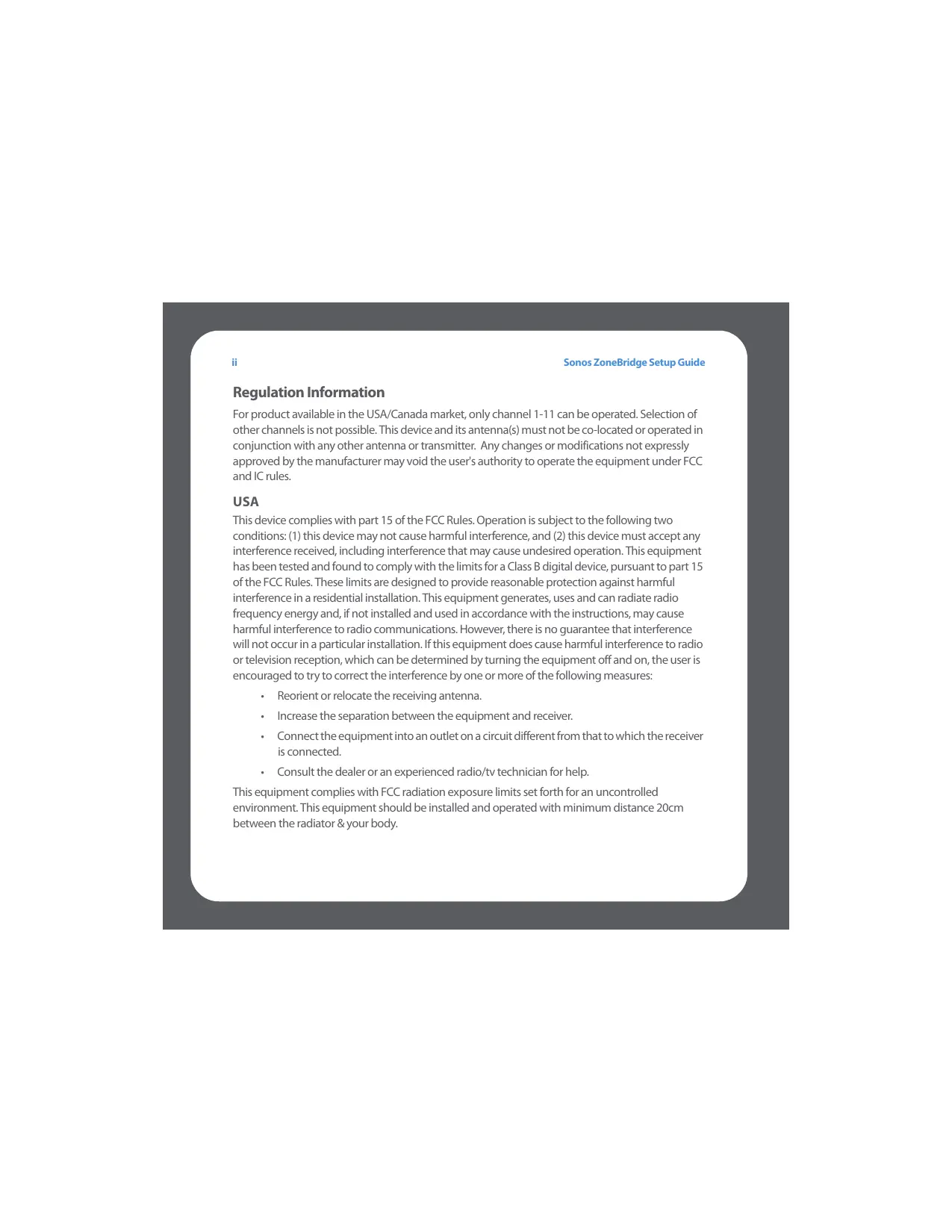 Sonos® ZoneBridge™ Setup Guide. For use with the Sonos Digital Music System. THIS DOCUMENT CONTAINS INFORMATION THAT IS SUBJECT TO CHANGE WITHOUT NOTICE. No part of this publication may be reproduced or transmitted in any form or by any means, electronic or mechanical, including but not limited to photocopying, recording, information retrieval systems, or computer network without the written permission of Sonos, Inc. Sonos is a registered trademark of Sonos, Inc. in the United States, Canada, and Australia, and a trademark of Sonos, Inc. in other countries. Sonosnet, ZonePlayer, ZoneBridge, and all Sonos logos are trademarks of Sonos, Inc. in the United States and/or other countries. Macintosh® and Mac OS® are trademarks of Apple Computer, Inc., registered in the U.S. and other countries. Windows Vista™ and Windows® XP are either registered trademarks or trademarks of Microsoft Corporation in the United States and/or other countries. This product includes technology owned by Microsoft Corporation and under a license from Microsoft Licensing, GP. Use or distribution of such technology outside of this product is prohibited without a license from Microsoft Corporation and/or Microsoft Licensing, GP as applicable. MPEG Layer-3 audio decoding technology licensed from Fraunhofer IIS and Thomson. Sonos uses MSNTP software, which was developed by N.M. Maclaren at the University of Cambridge. © Copyright, N.M. Maclaren, 1996, 1997, 2000; © Copyright, University of Cambridge, 1996, 1997, 2000. All other products and services mentioned may be trademarks or service marks of their respective owners. © 2004-2007 by Sonos, Inc. All rights reserved. For the latest product documentation, including the Sonos Digital Music System User Guide, go to www.sonos.com/support and click Documents. ZoneBridge Setup Guide Version: 071023 Regulation Information For product available in the USA/Canada market, only channel 1-11 can be operated. Selection of other channels is not possible. This device and its antenna(s) must not be co-located or operated in conjunction with any other antenna or transmitter. Any changes or modifications not expressly approved by the manufacturer may void the user's authority to operate the equipment under FCC and IC rules. USA This device complies with part 15 of the FCC Rules. Operation is subject to the following two conditions: (1) this device may not cause harmful interference, and (2) this device must accept any interference received, including interference that may cause undesired operation. This equipment has been tested and found to comply with the limits for a Class B digital device, pursuant to part 15 of the FCC Rules. These limits are designed to provide reasonable protection against harmful interference in a residential installation. This equipment generates, uses and can radiate radio frequency energy and, if not installed and used in accordance with the instructions, may cause harmful interference to radio communications. However, there is no guarantee that interference will not occur in a particular installation. If this equipment does cause harmful interference to radio or television reception, which can be determined by turning the equipment off and on, the user is encouraged to try to correct the interference by one or more of the following measures: