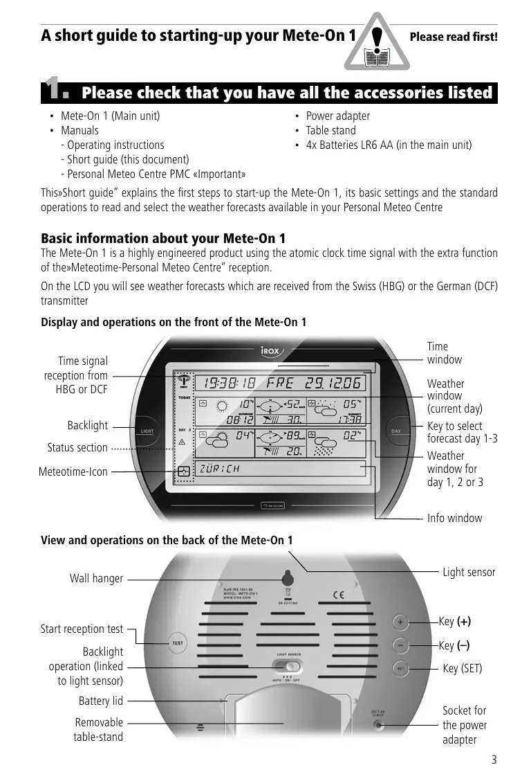 This Short guide" explains the first steps to start-up the Mete-On 1, its basic settings and the standard operations to read and select the weather forecasts available in your Personal Meteo Centre